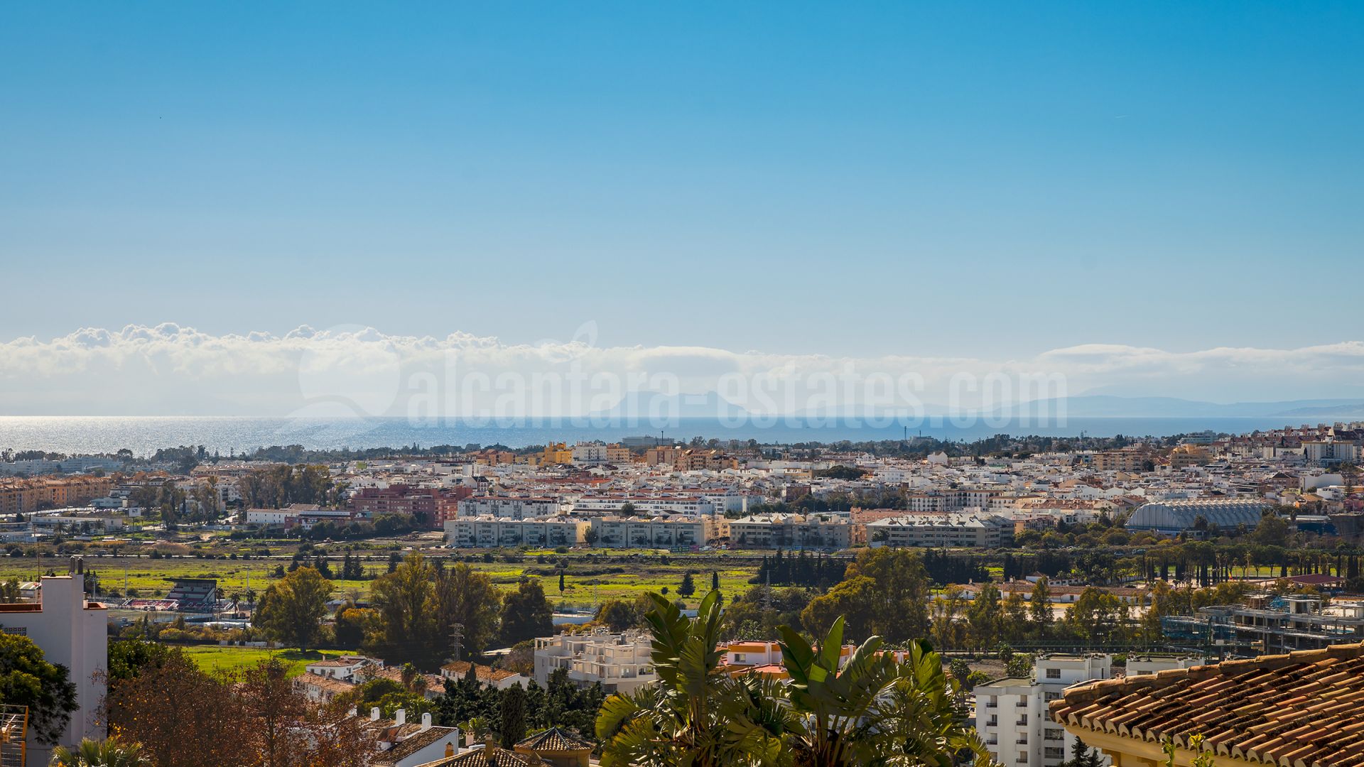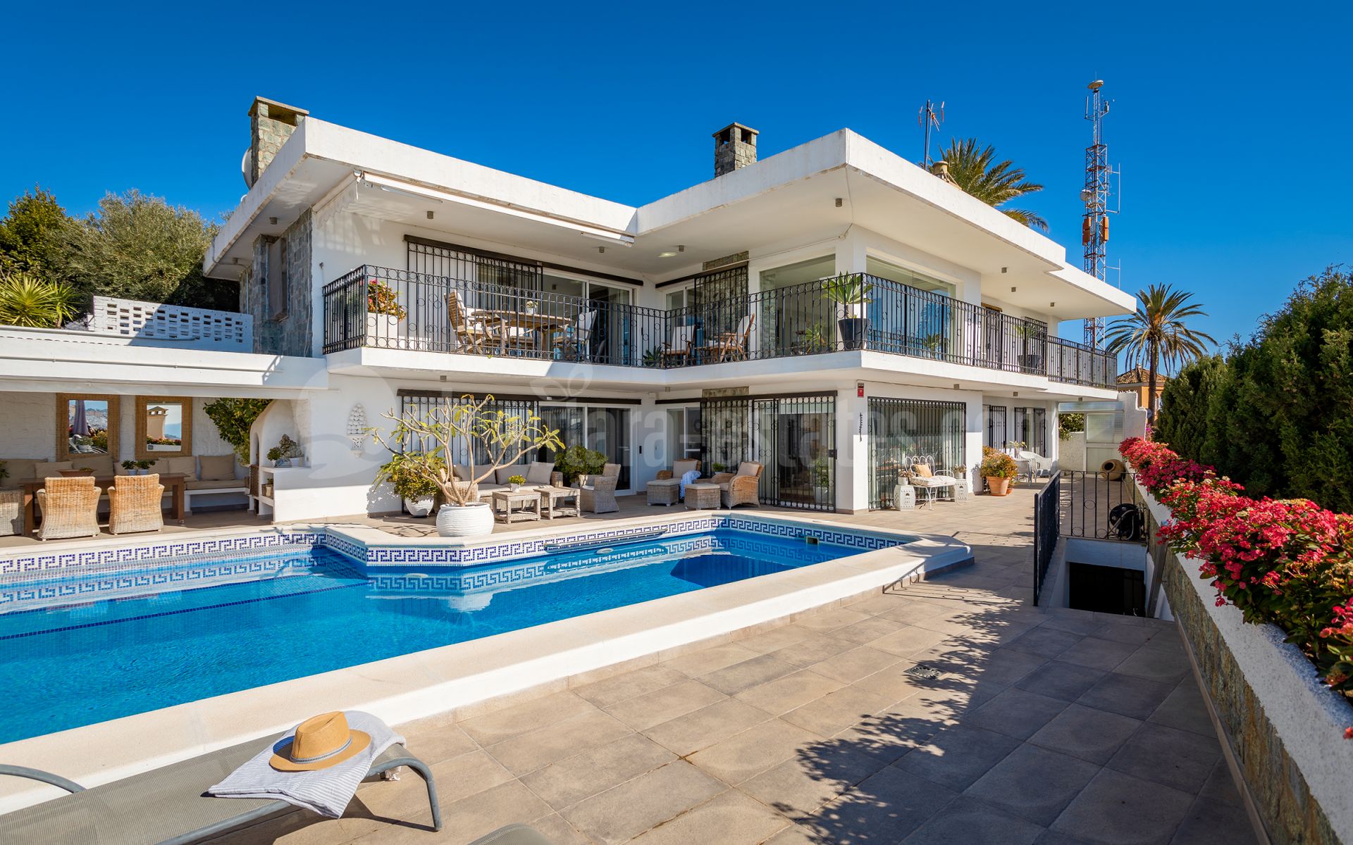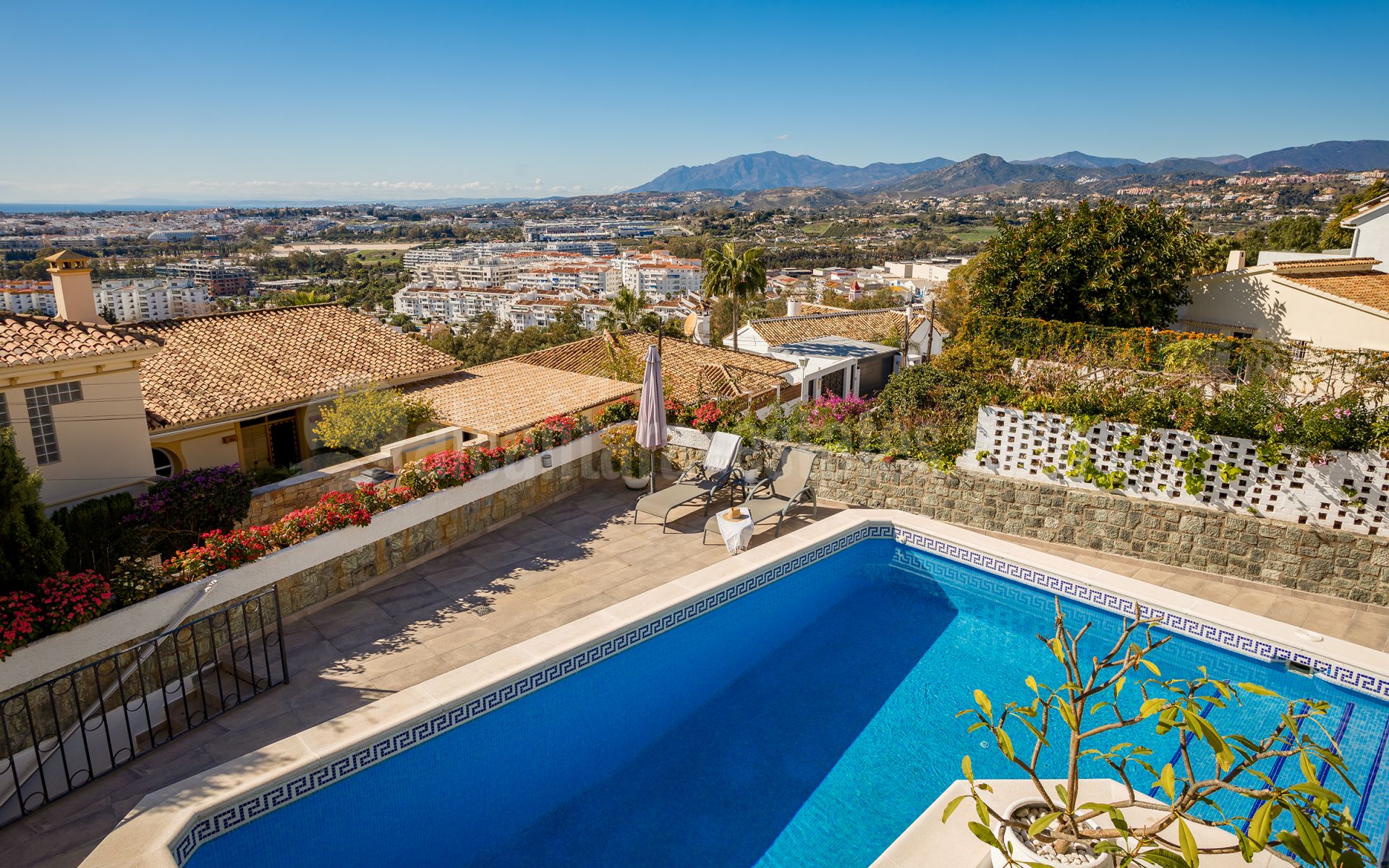 Fantastic villa with panoramic sea views walking distance to amenities in Nueva Andalucia. Built on three levels, property comprises, on entrance level: en-suite master bedroom; living/dining room with fireplace and access to the terraces enjoying the panoramic sea views; fully equipped kitchen with laundry room & dirty kitchen with separate entrance; guest toilet. Middle floor: double sitting room with fireplace and access to the heated swimming pool & bbq area; an office; 2 bedrooms sharing a bathroom; and a guest toilet. Basement: en-suite bedroom; garage with space for 4 cars; 2 large storages; a tool workshop; a wine cellar; the machinery room. Extra features include: alarm system; underfloor heating in the bathrooms; solar panels for the whole electric system. A property with lots of potential just a 5-minute drive (or 25-minute walk) to the beach and Puerto Banús.