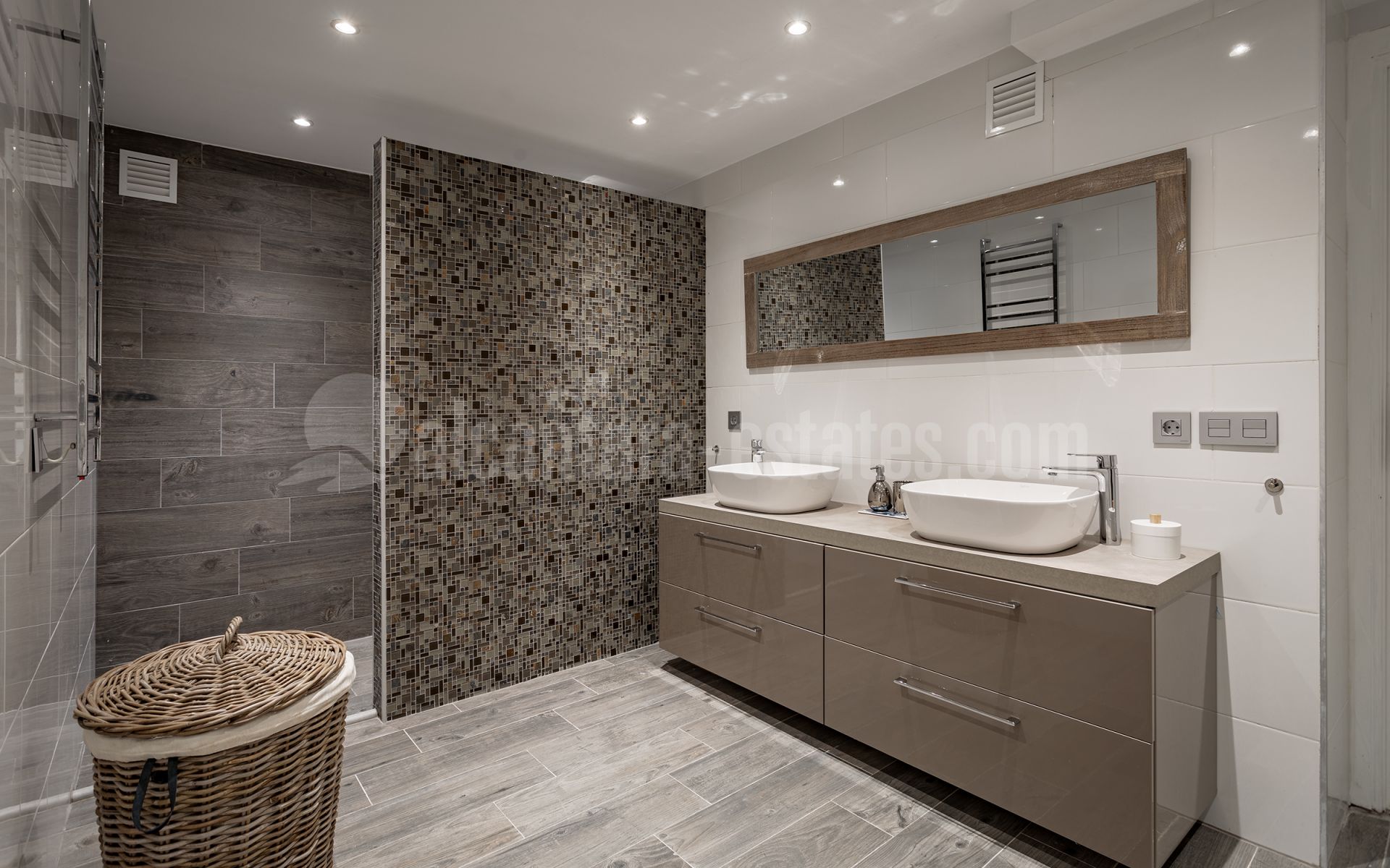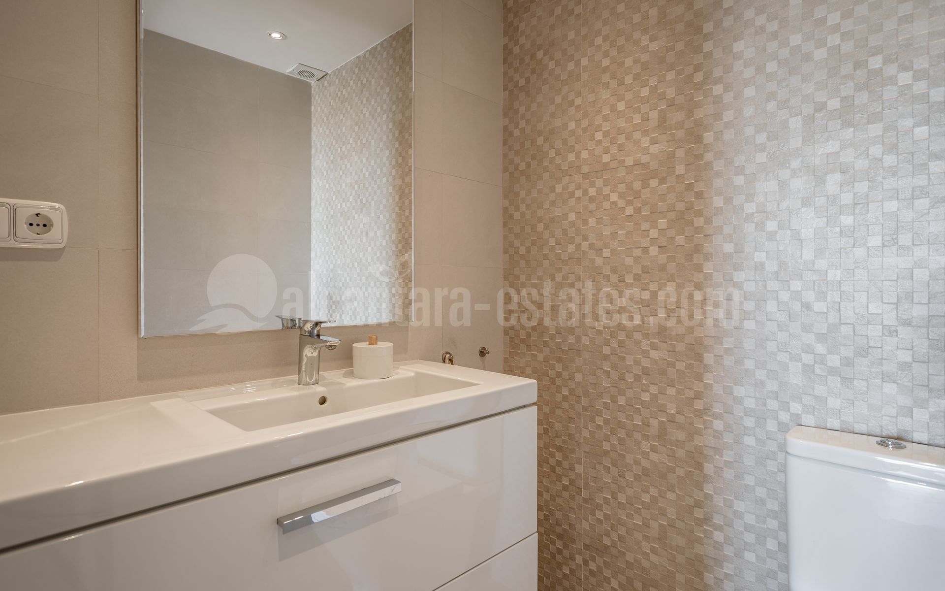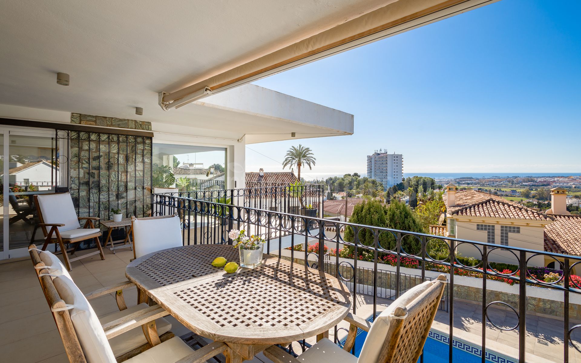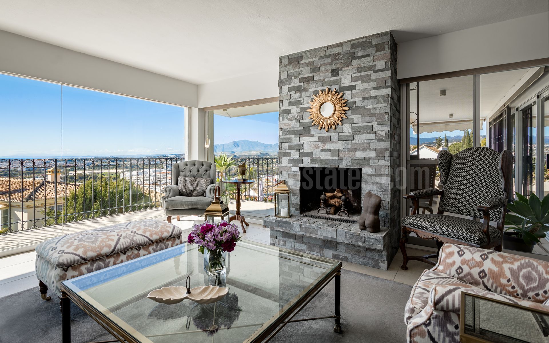 Fantastic villa with panoramic sea views walking distance to amenities in Nueva Andalucia. Built on three levels, property comprises, on entrance level: en-suite master bedroom; living/dining room with fireplace and access to the terraces enjoying the panoramic sea views; fully equipped kitchen with laundry room & dirty kitchen with separate entrance; guest toilet. Middle floor: double sitting room with fireplace and access to the heated swimming pool & bbq area; an office; 2 bedrooms sharing a bathroom; and a guest toilet. Basement: en-suite bedroom; garage with space for 4 cars; 2 large storages; a tool workshop; a wine cellar; the machinery room. Extra features include: alarm system; underfloor heating in the bathrooms; solar panels for the whole electric system. A property with lots of potential just a 5-minute drive (or 25-minute walk) to the beach and Puerto Banús.