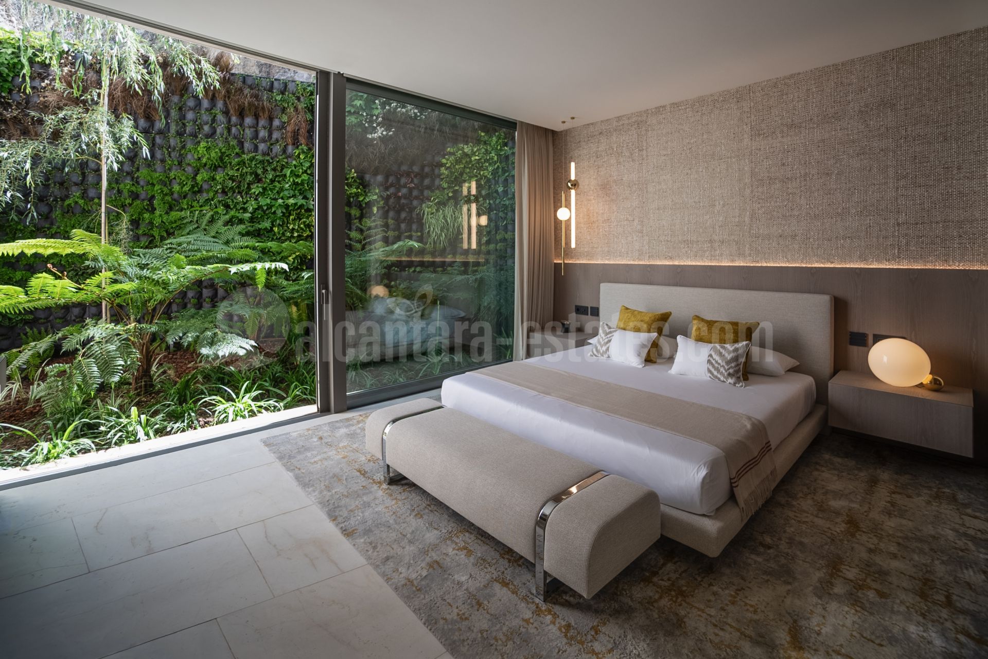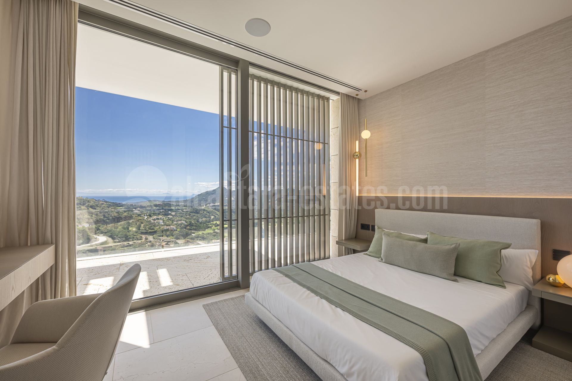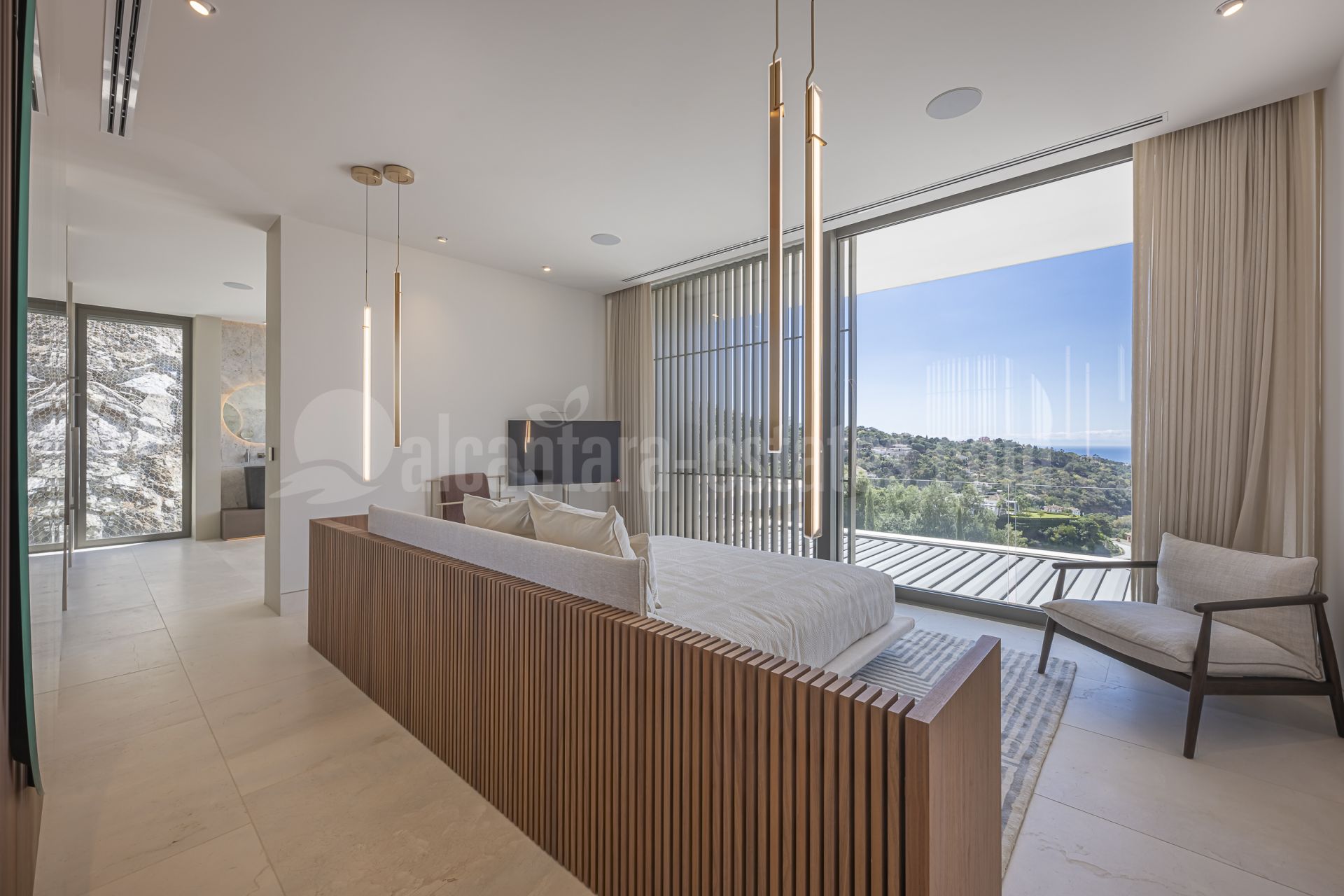 The master bedroom is a true oasis of relaxation, with large windows that offer stunning views of the mountains and sea.