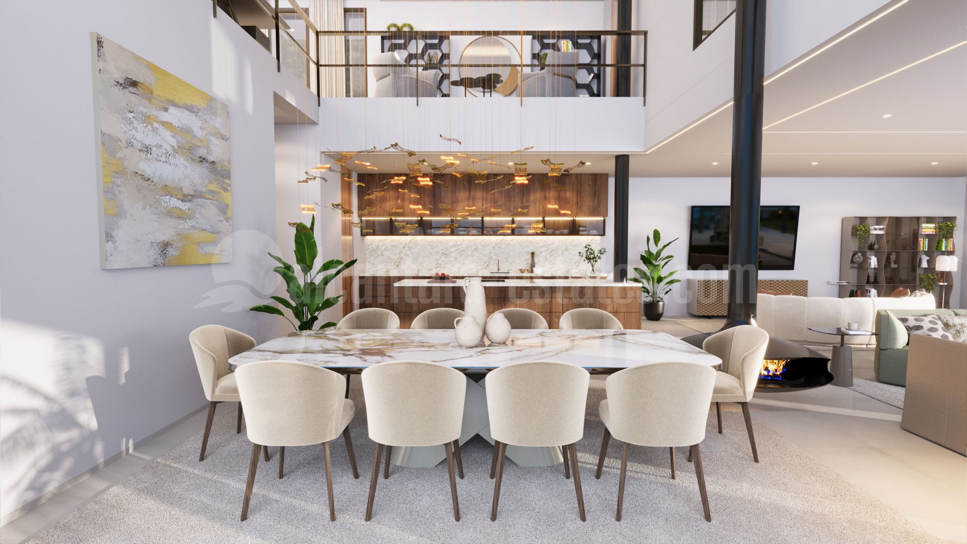 On the ground level, the main entrance leads to the left wing where you’ll find open space living and dining areas with a kitchen boasting double-height ceilings. The living area features a hanging chimney operated with a remote control, allowing it to be moved around. A door in the kitchen connects to the service kitchen, which has private access for personnel.