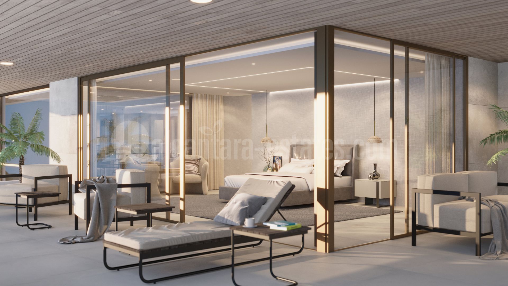 The first floor has two wings as well. The left wing features the spacious master bedroom with an en-suite bathroom, toilet, and walk-in closet, which includes a central island for storing the most valuable items of your wardrobe, such as jewelry and unique bags. The island also includes a hidden feature. The master bedroom’s private terrace includes a chill-out area and sunbeds. The left wing also includes an office and library, where the windows can also be fully opened, similar to the living area. The right wing contains two more bedrooms with en-suite bathrooms and private terraces.