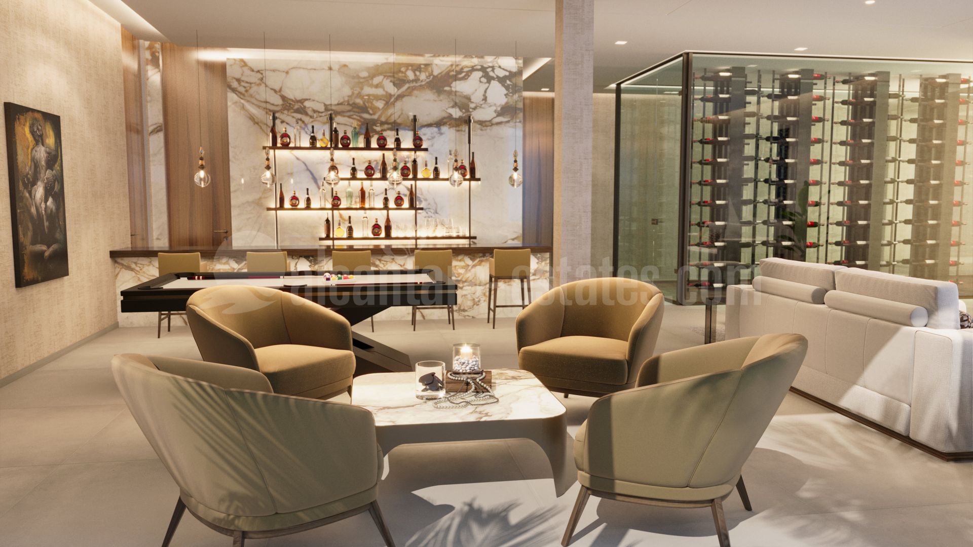 The lower level includes a wine cellar, bar, cinema, multipurpose room with billiards and chill areas, fully equipped gym, and spa with an indoor heated pool, sauna, Turkish bath, and hydromassage shower. The gym provides panoramic views. The SPA not only offers stunning coastal views but also showcases the villa’s waterfall. Furthermore, this level includes a service apartment with its own living area, kitchen, and bathroom, featuring a private entrance and direct access to the main service kitchen.