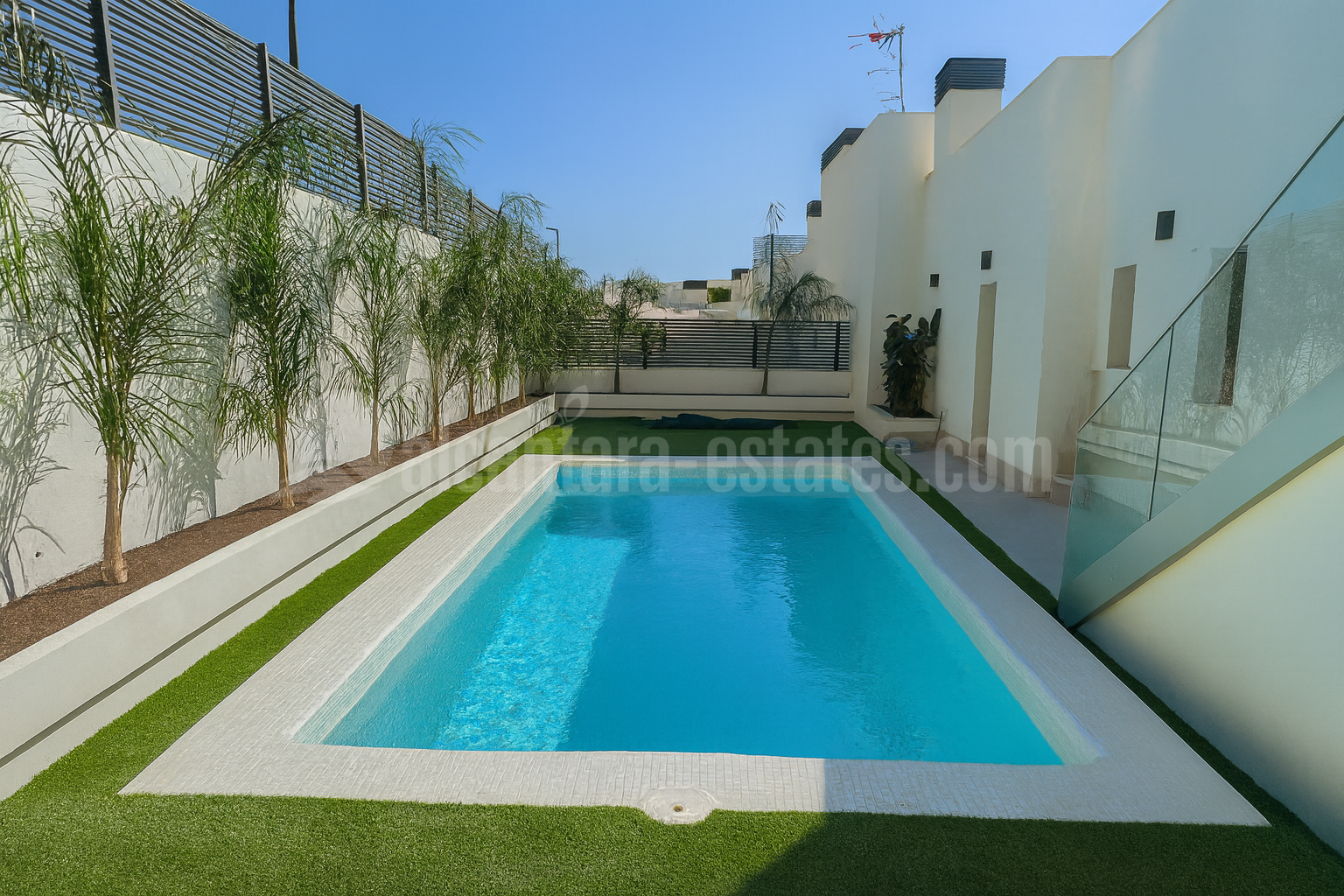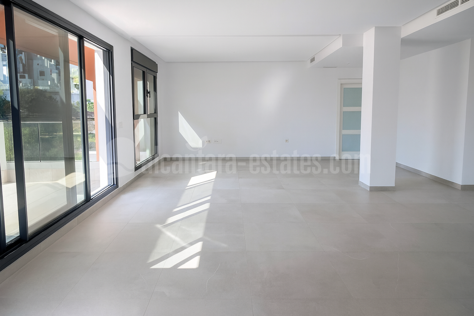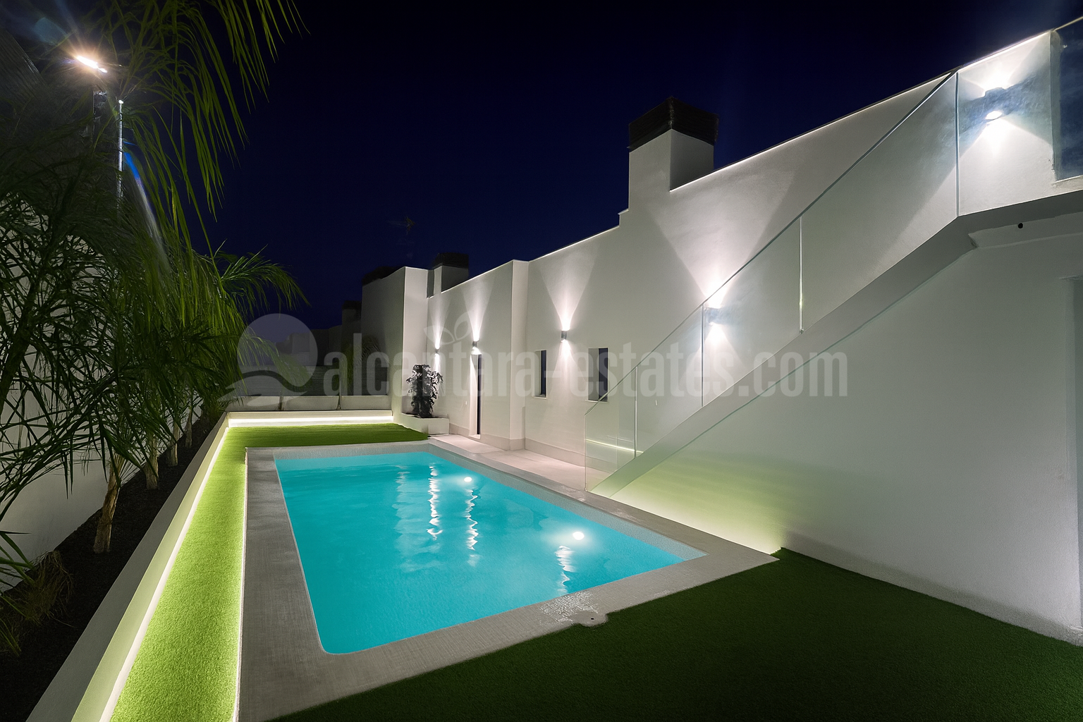 The main floor features a spacious open-plan living and dining area connected to a sleek modern kitchen with premium appliances and ambient LED lighting. Floor-to-ceiling windows open onto a stunning 97 m² terrace with a brand-new private pool — the perfect setting for relaxing, entertaining, and enjoying the Costa del Sol sunshine.
