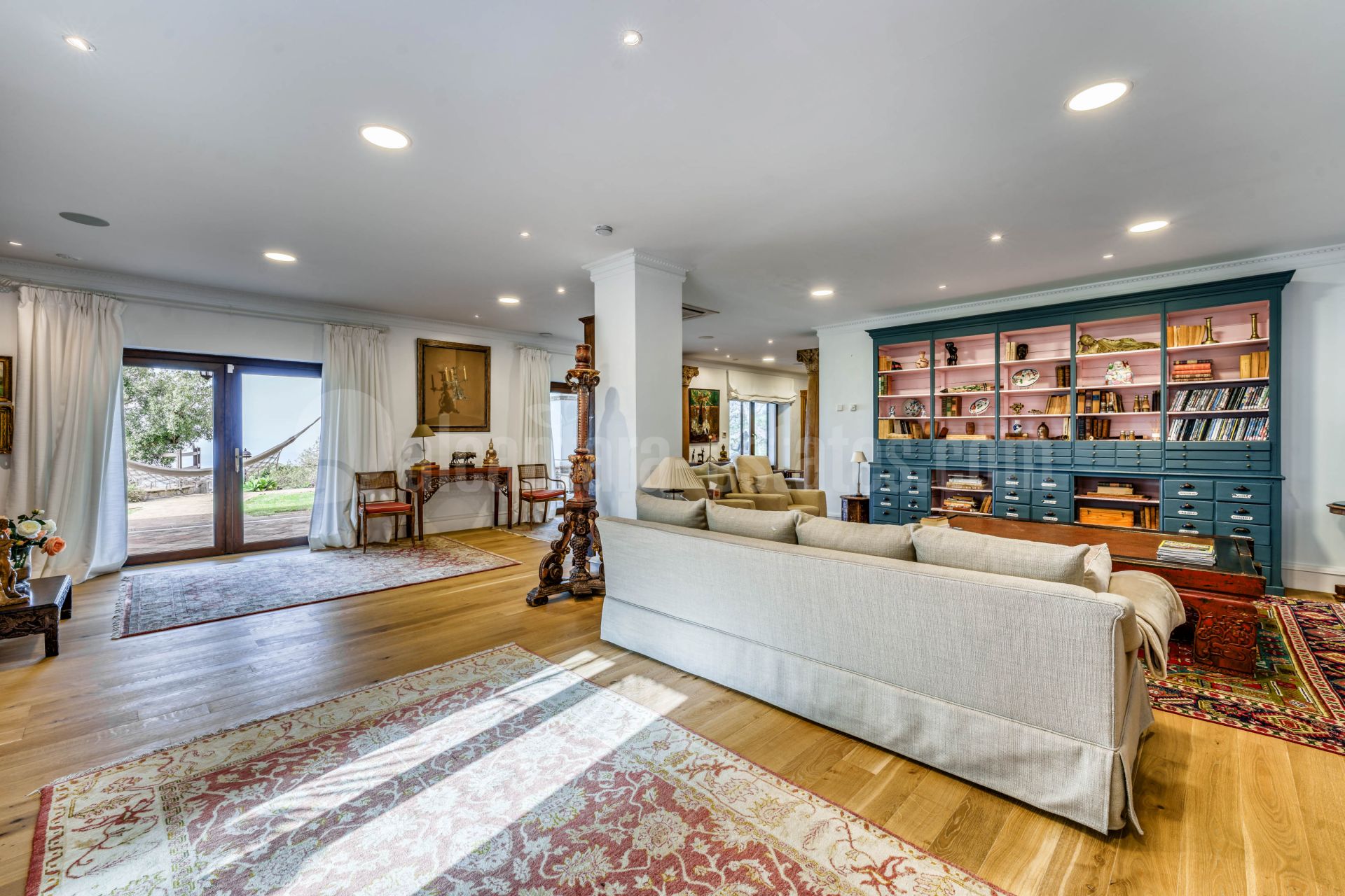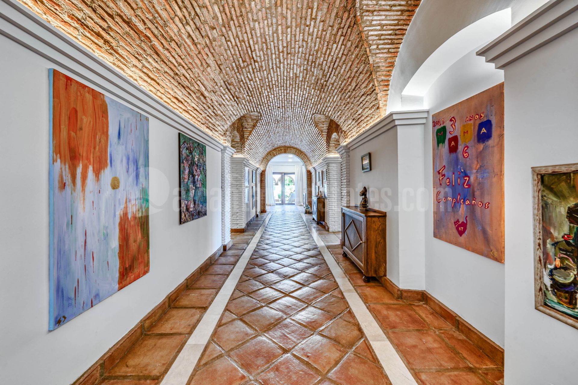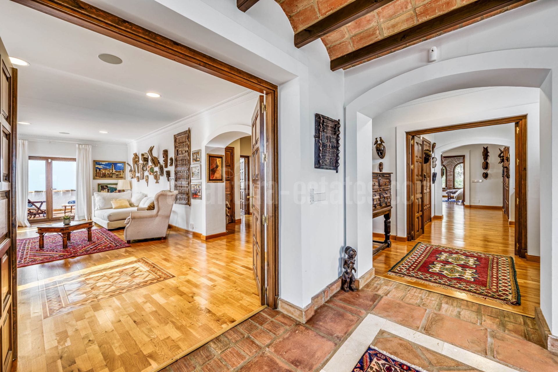 La residencia principal esta distribuida en dos niveles, con un diseño cuidadosamente pensado y un ascensor. La planta baja consta de un amplio salón con biblioteca adyacente, una cocina totalmente equipada, un comedor, una acogedora sala de estar con chimenea y tres lujosas suites, dos de las cuales incluyen un salón. Estas áreas se conectan a través de un elegante pasillo decorado con techos abovedados. Además, la planta baja alberga una zona de gimnasio con jacuzzi, dos aseos de invitados, lavandería y trastero. Separada del edificio principal, hay una piscina cubierta con un vestidor y un aseo; garaje para 6 coches, así como un apartamento de servicio totalmente equipado. La planta baja da acceso a una variedad de amplias terrazas, porches y patios acogedores, para disfrutar al aire libre.