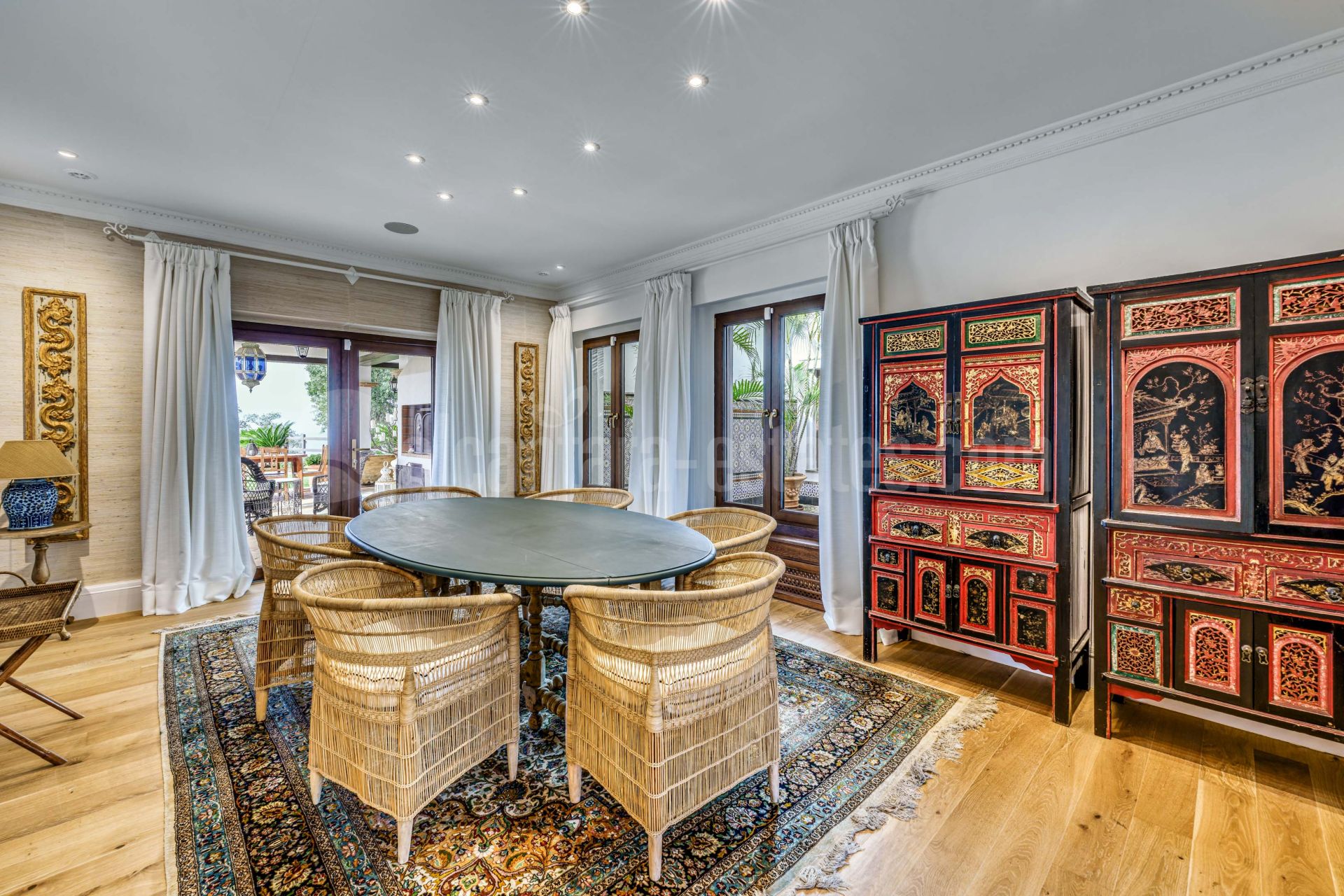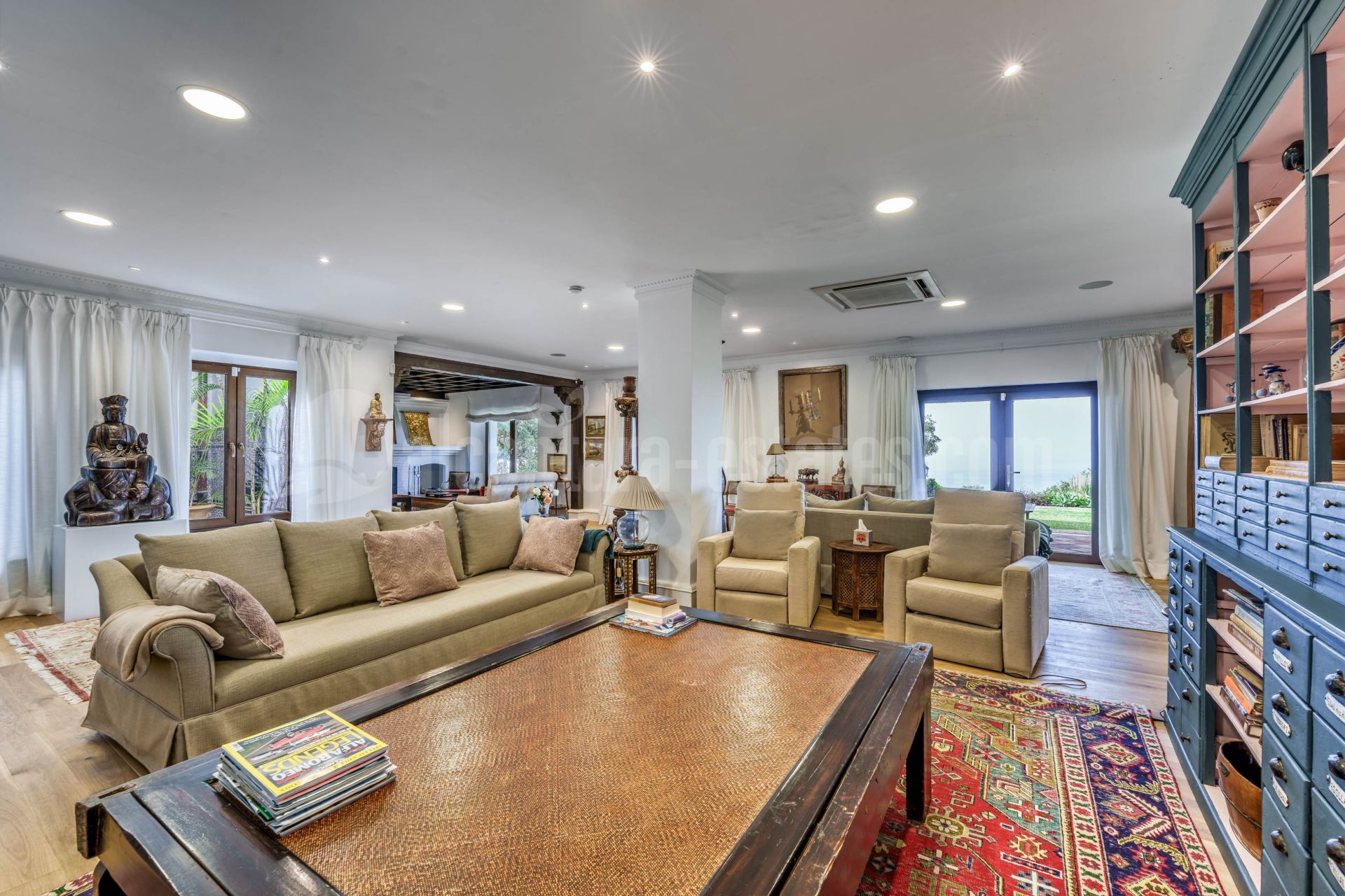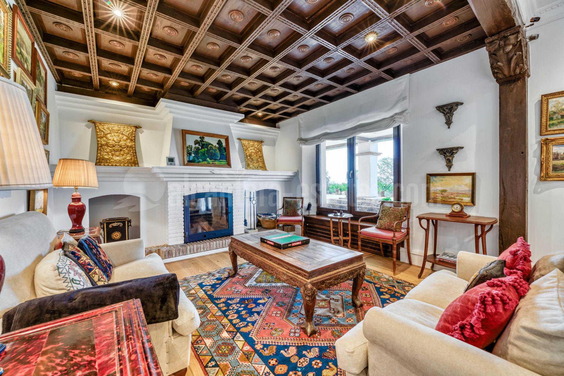 La residencia principal esta distribuida en dos niveles, con un diseño cuidadosamente pensado y un ascensor. La planta baja consta de un amplio salón con biblioteca adyacente, una cocina totalmente equipada, un comedor, una acogedora sala de estar con chimenea y tres lujosas suites, dos de las cuales incluyen un salón. Estas áreas se conectan a través de un elegante pasillo decorado con techos abovedados. Además, la planta baja alberga una zona de gimnasio con jacuzzi, dos aseos de invitados, lavandería y trastero. Separada del edificio principal, hay una piscina cubierta con un vestidor y un aseo; garaje para 6 coches, así como un apartamento de servicio totalmente equipado. La planta baja da acceso a una variedad de amplias terrazas, porches y patios acogedores, para disfrutar al aire libre.