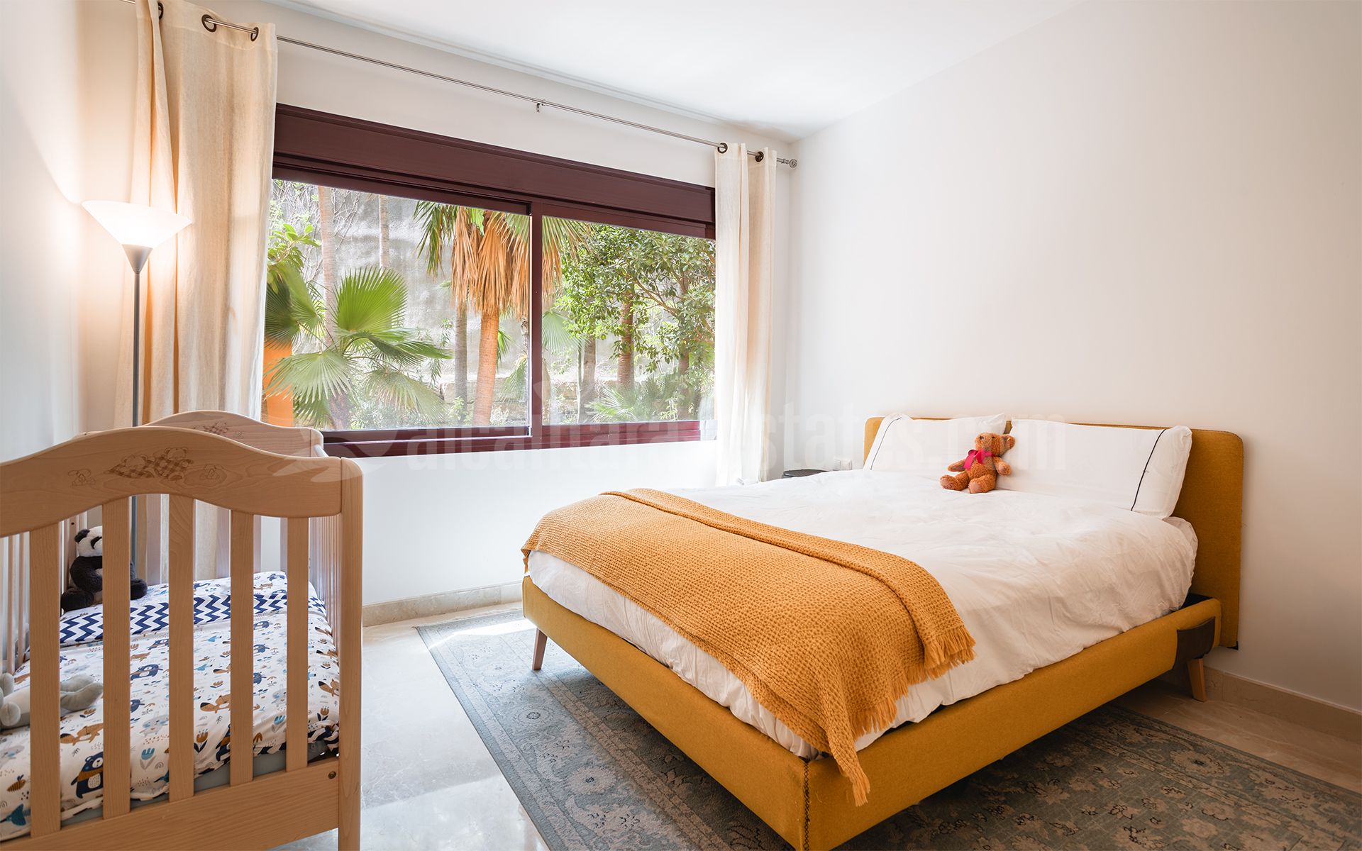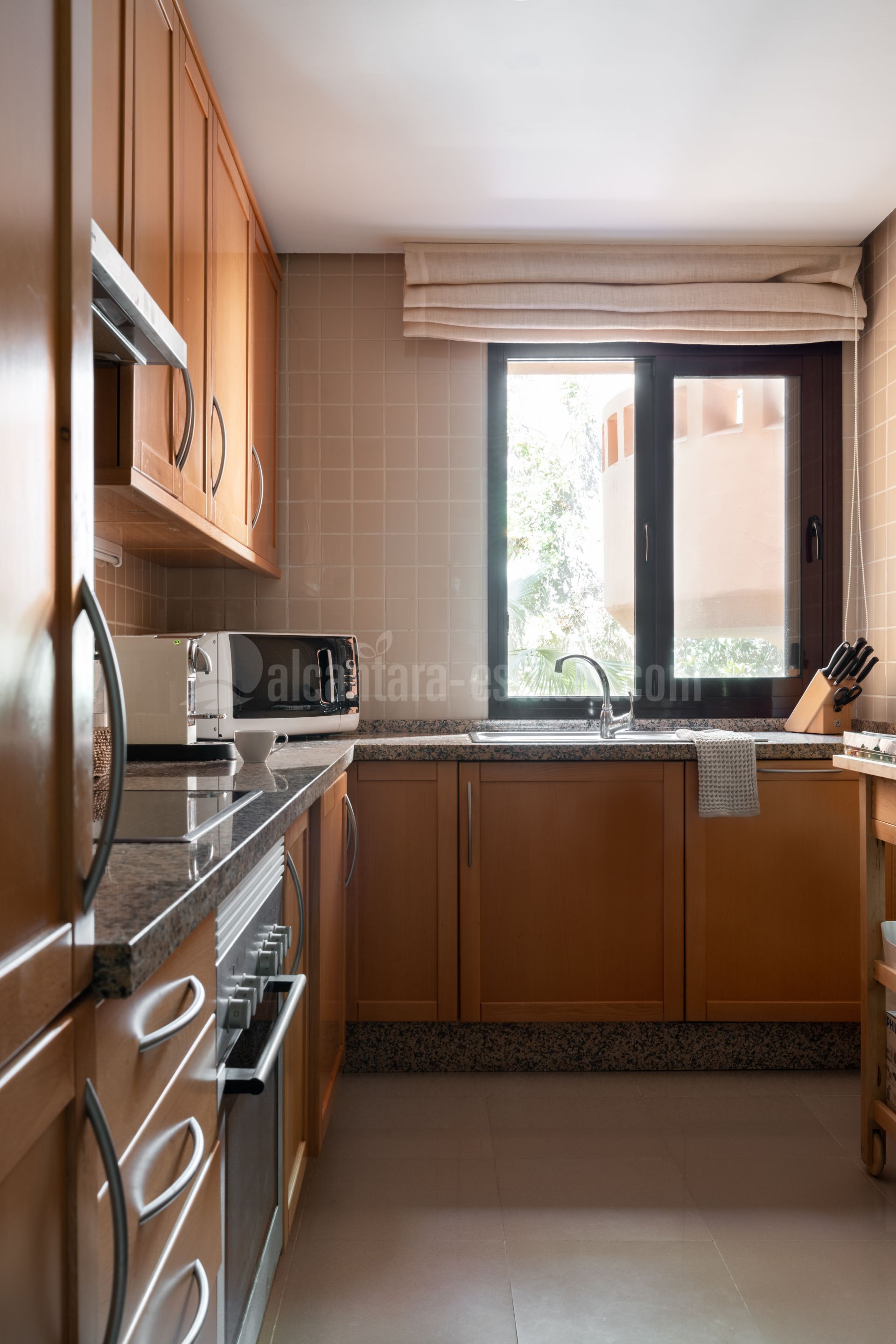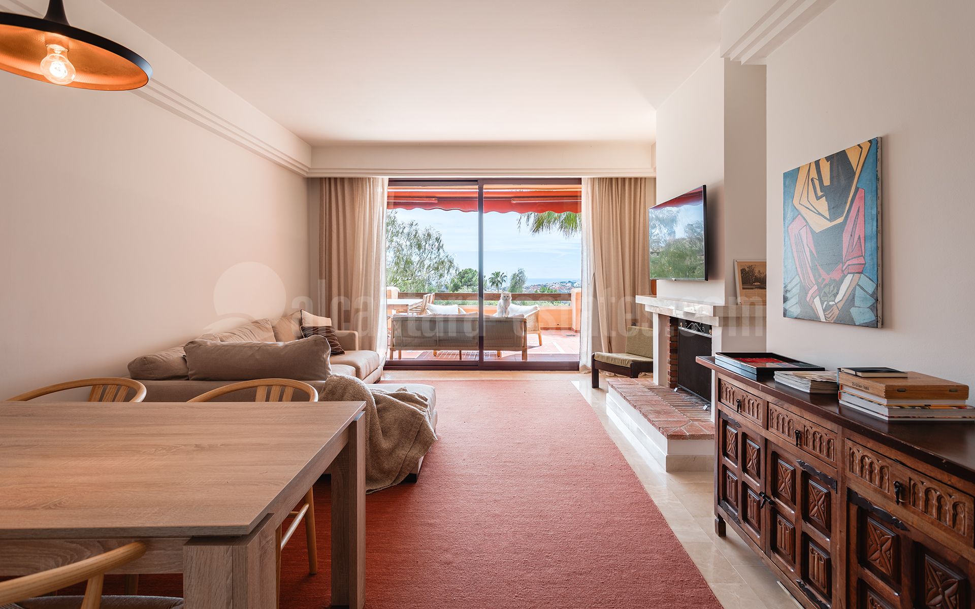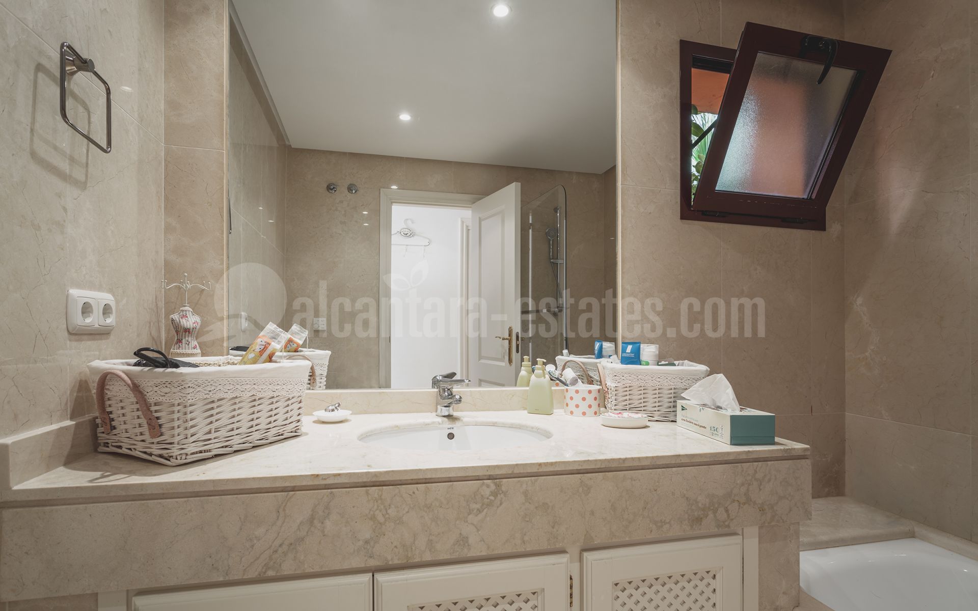 Bañado por la luz natural, el apartamento cuenta con un amplio salón-comedor con chimenea funcional, que se abre a una terraza parcialmente cubierta con vistas panorámicas al Mediterráneo, Gibraltar y África. La cocina independiente, totalmente equipada, ofrece una gran superficie de trabajo y armarios espaciosos y bien distribuidos. Dispone de dos amplios dormitorios dobles en suite con armarios empotrados, siendo el principal con acceso directo a la terraza, además de un aseo de invitados que aporta comodidad para las visitas.