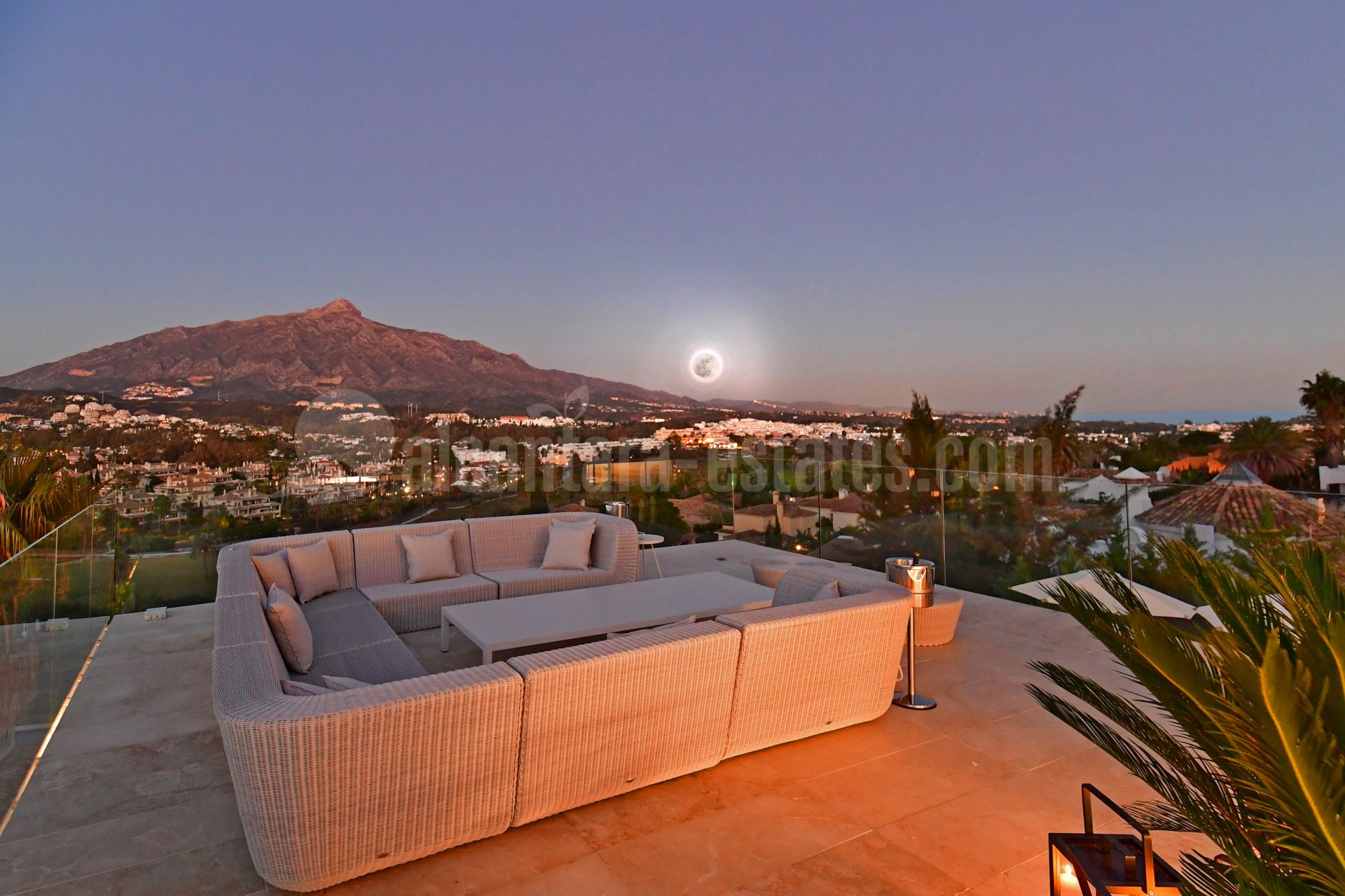 Al entrar en esta extraordinaria villa, la arquitectura moderna se funde armoniosamente con la vista panorámica sobre la montaña de La Concha y el campo de golf de Las Brisas.