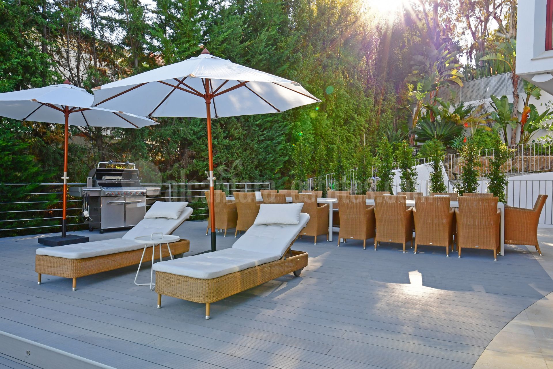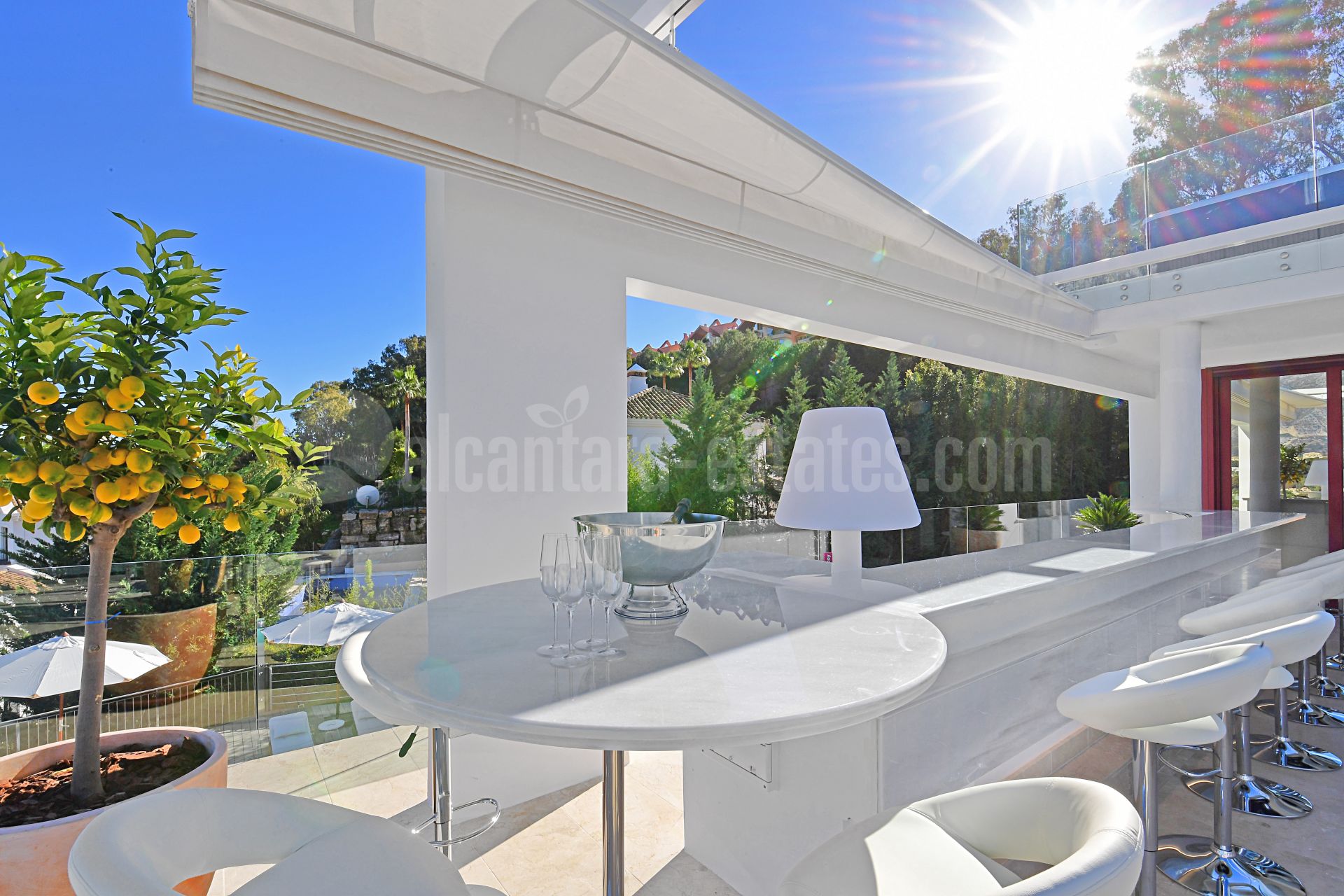 En el exterior cuenta con una amplia terraza con palmeras, una gran piscina infinita climatizada y jacuzzi. La excelente zona de barbacoa es ideal para pasar el tiempo libre y cenar bajo las estrellas, mientras que el bar parcialmente cubierto y los asientos del salón en la terraza del segundo nivel pueden elevar el ambiente de calma a una gran fiesta con total privacidad y vistas hacia las montañas y el mar. Se trata de una impresionante vivienda de lujo.