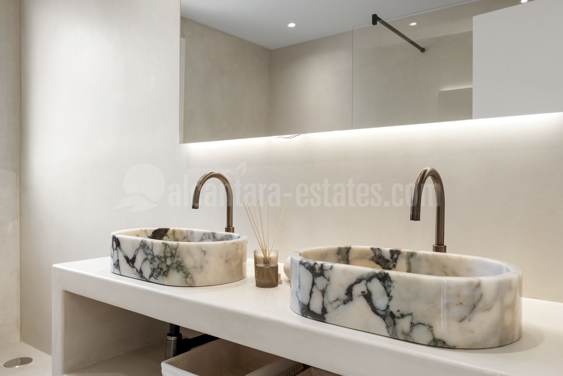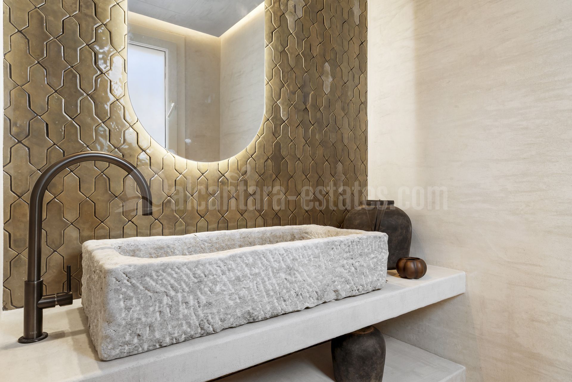 Cada uno de los cuatro dormitorios en suite ha sido diseñado con un gusto exquisito, ofreciendo un refugio de tranquilidad y privacidad para residentes e invitados. La planta superior alberga una terraza privada con vistas parciales al mar, perfecta para disfrutar de un café matutino o de momentos de relajación al atardecer.