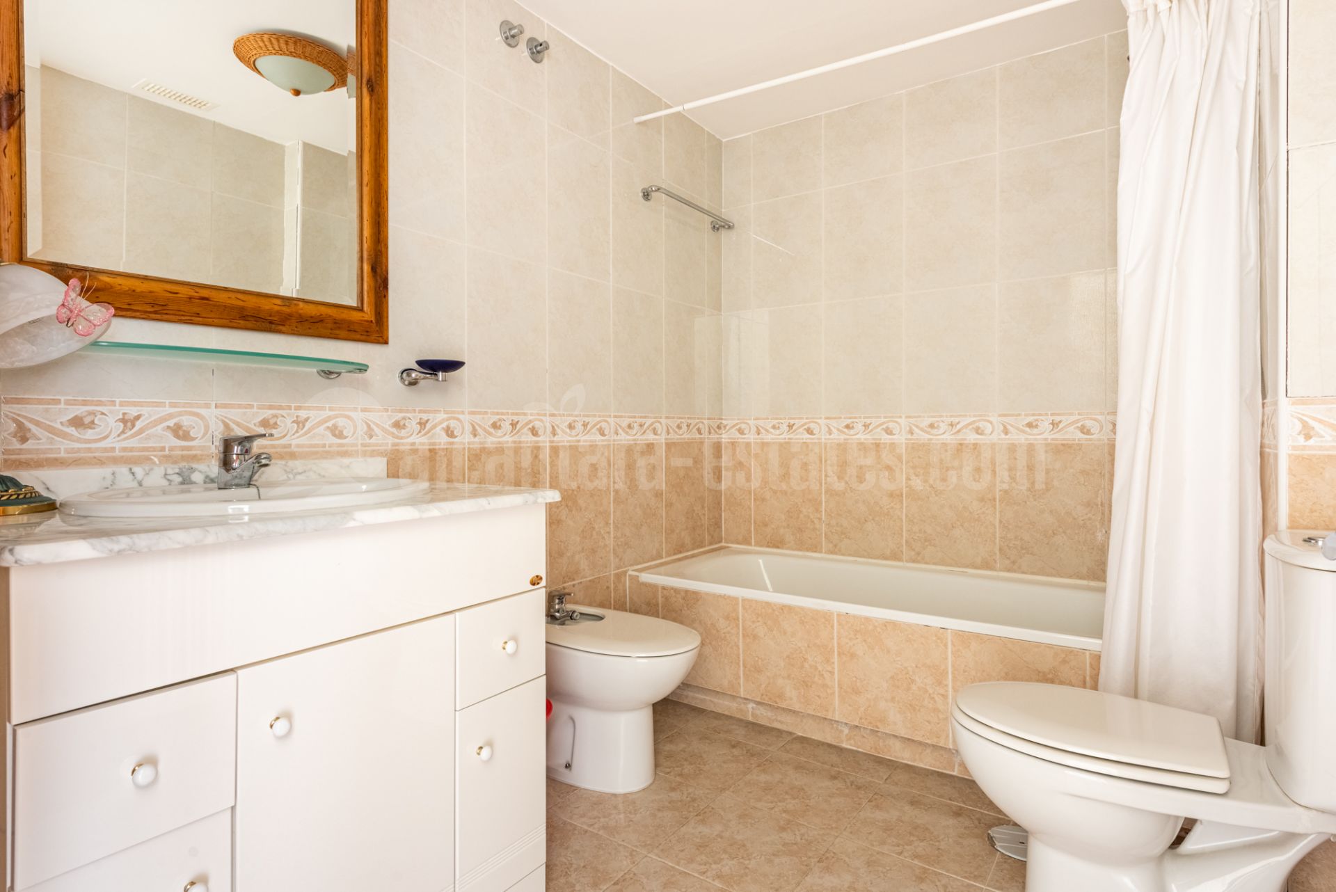 En la planta principal, encontrarás un salón luminoso y amplio que se abre a una gran terraza con impresionantes vistas al campo de golf de Guadalmina y a las montañas circundantes. En este nivel también hay dos dormitorios para invitados, uno de ellos con baño en suite y ambos con acceso a una terraza privada, además de un baño independiente para invitados. La cocina en esta planta podría convertirse en un quinto dormitorio o en un amplio baño adicional, lo que ofrece una mayor flexibilidad.