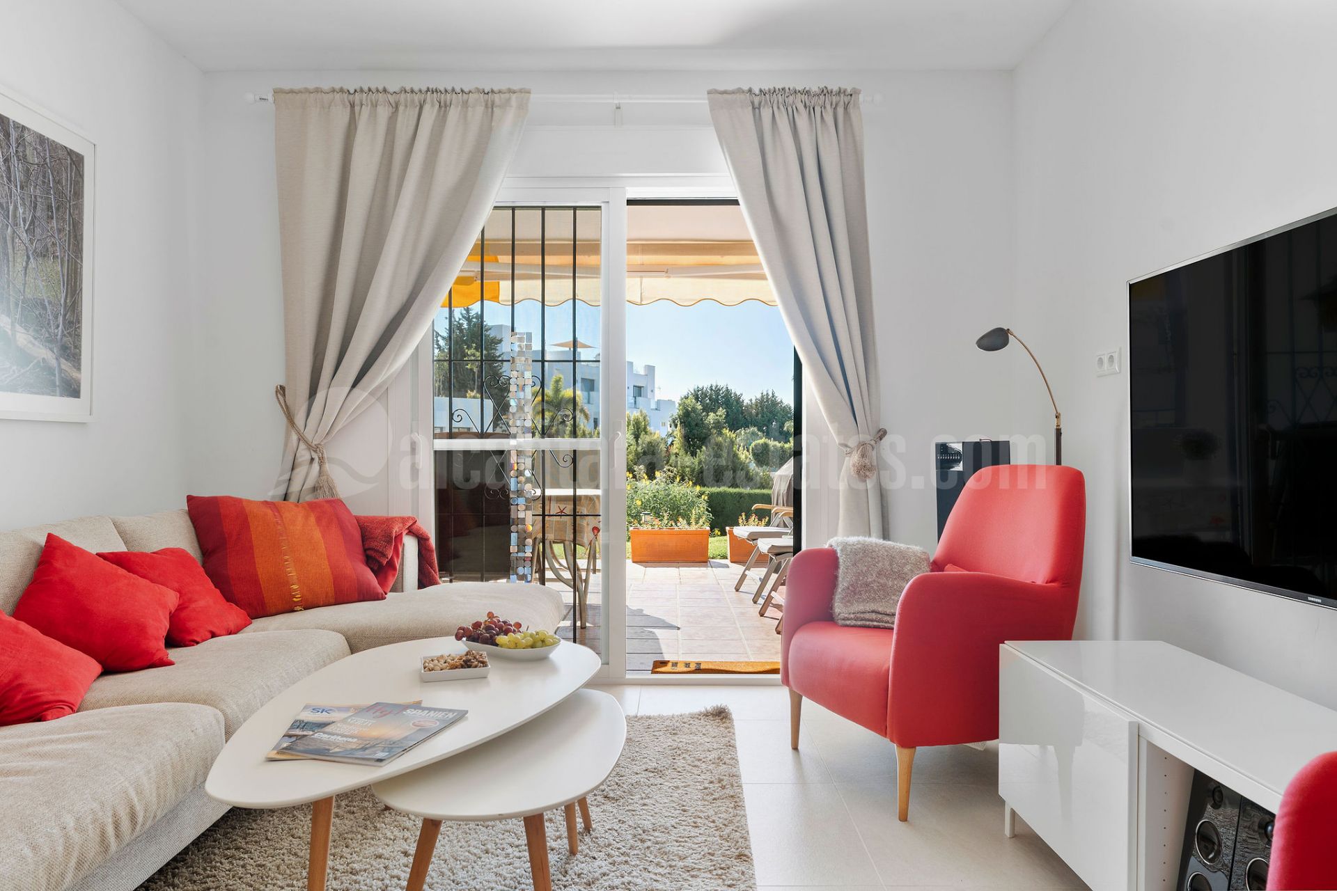 El apartamento ofrece dos terrazas: una terraza orientada al sur con acceso directo a la piscina y los jardines, además de un acogedor patio en la entrada, ideal para disfrutar del sol de la mañana o como un espacio adicional para comer.