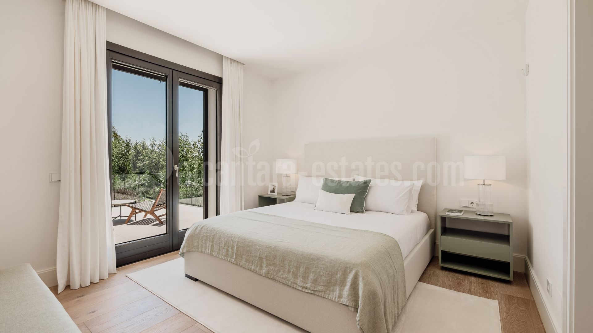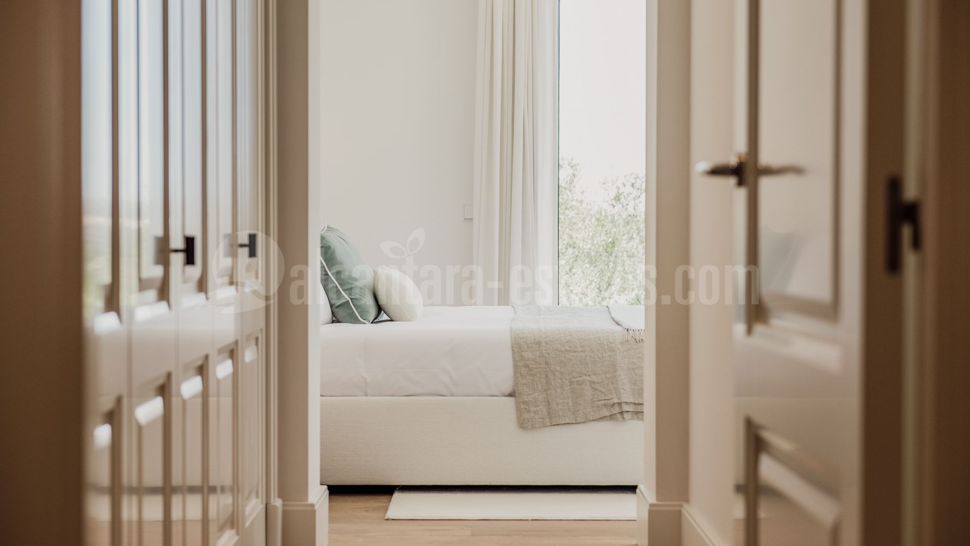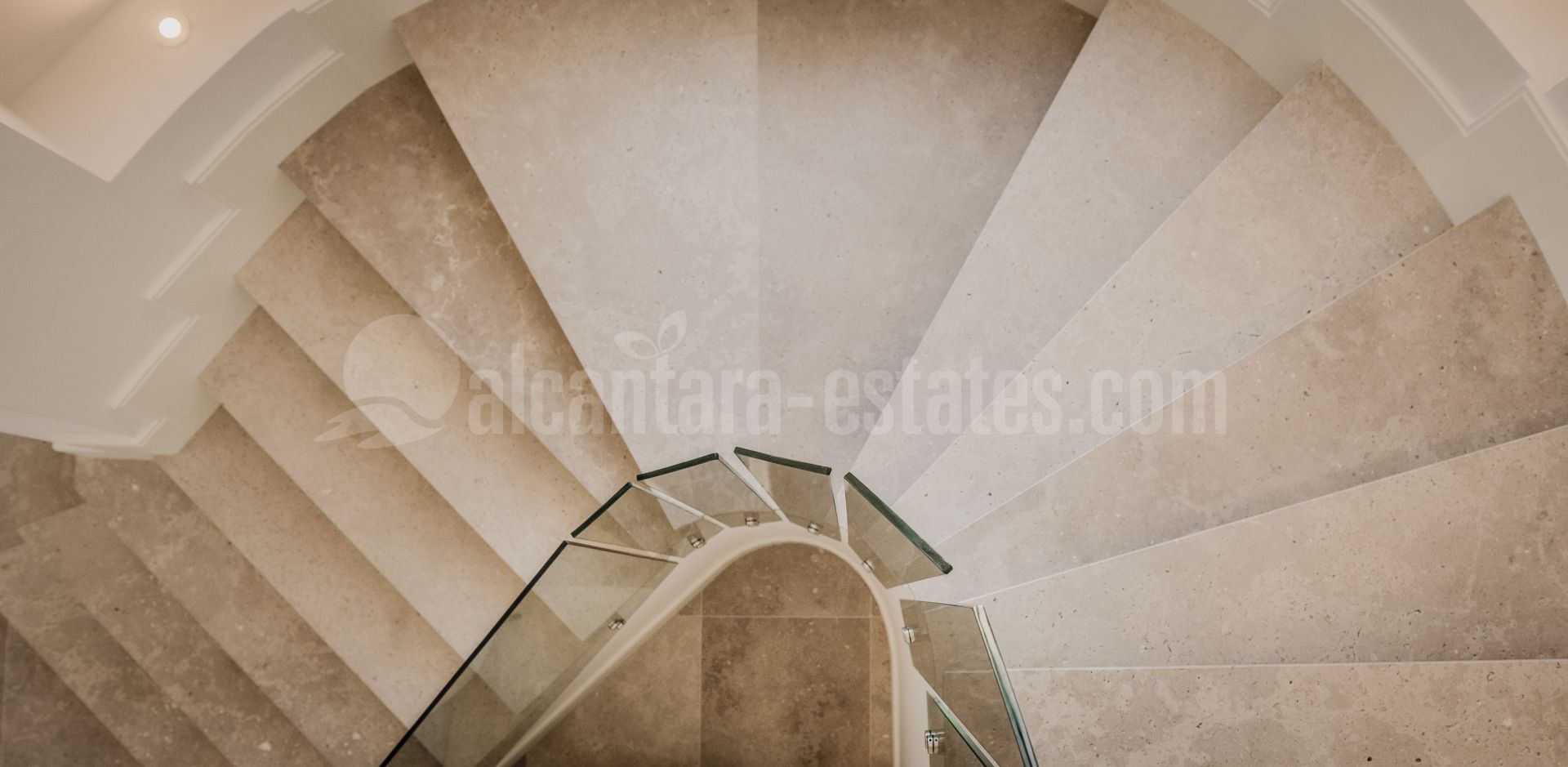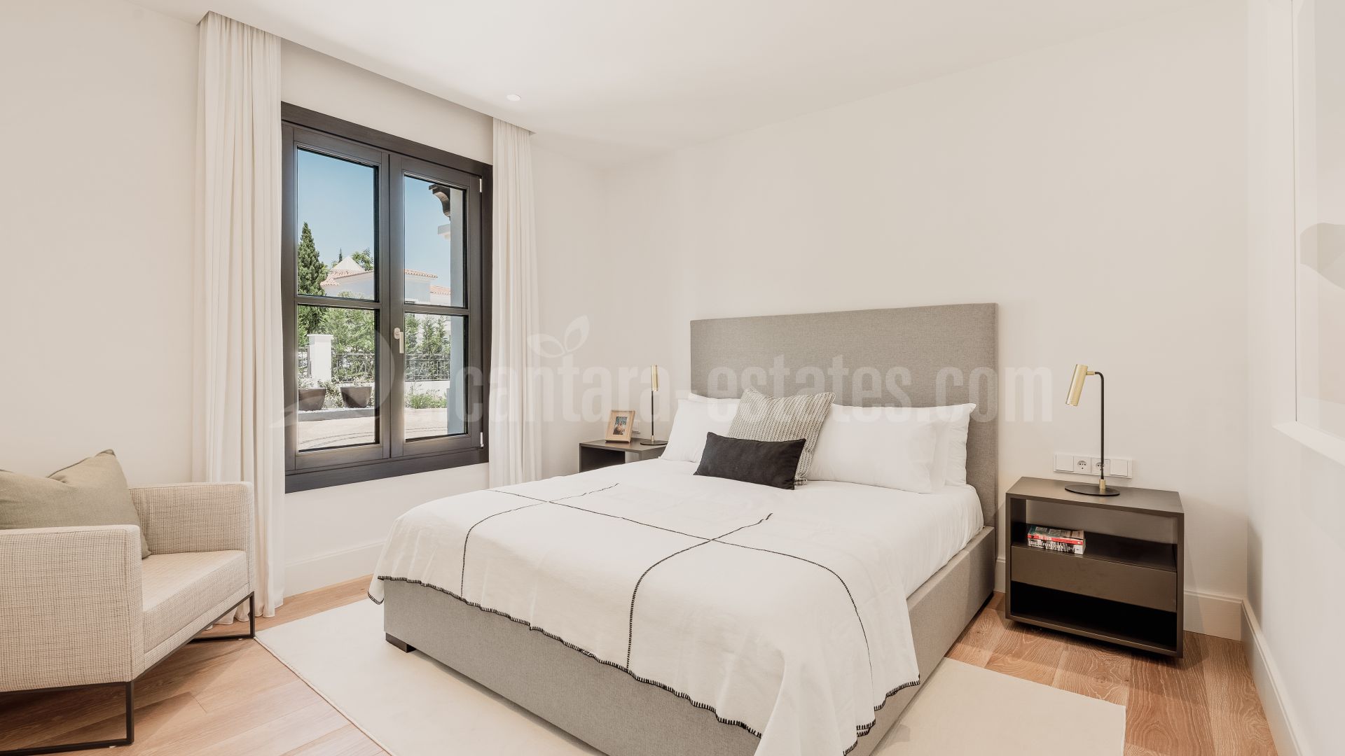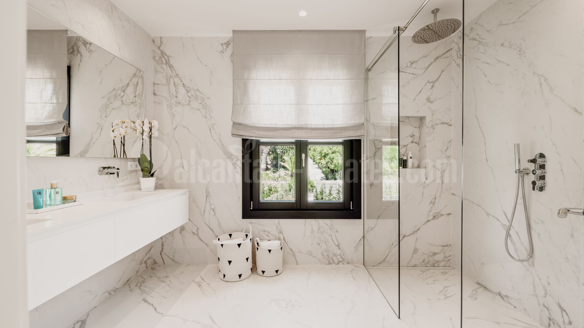 La planta superior cuenta con otros tres dormitorios con baños en suite y vestidores. Uno de los dormitorios de invitados da al mar con una terraza privada, mientras que el otro, actualmente utilizado como oficina, da al jardín. La gran suite principal tiene una terraza privada con vistas al mar, dos vestidores y un baño lujosamente equipado con vistas al mar.