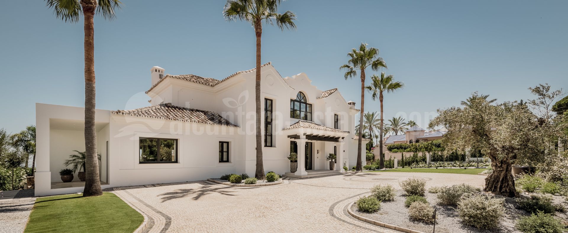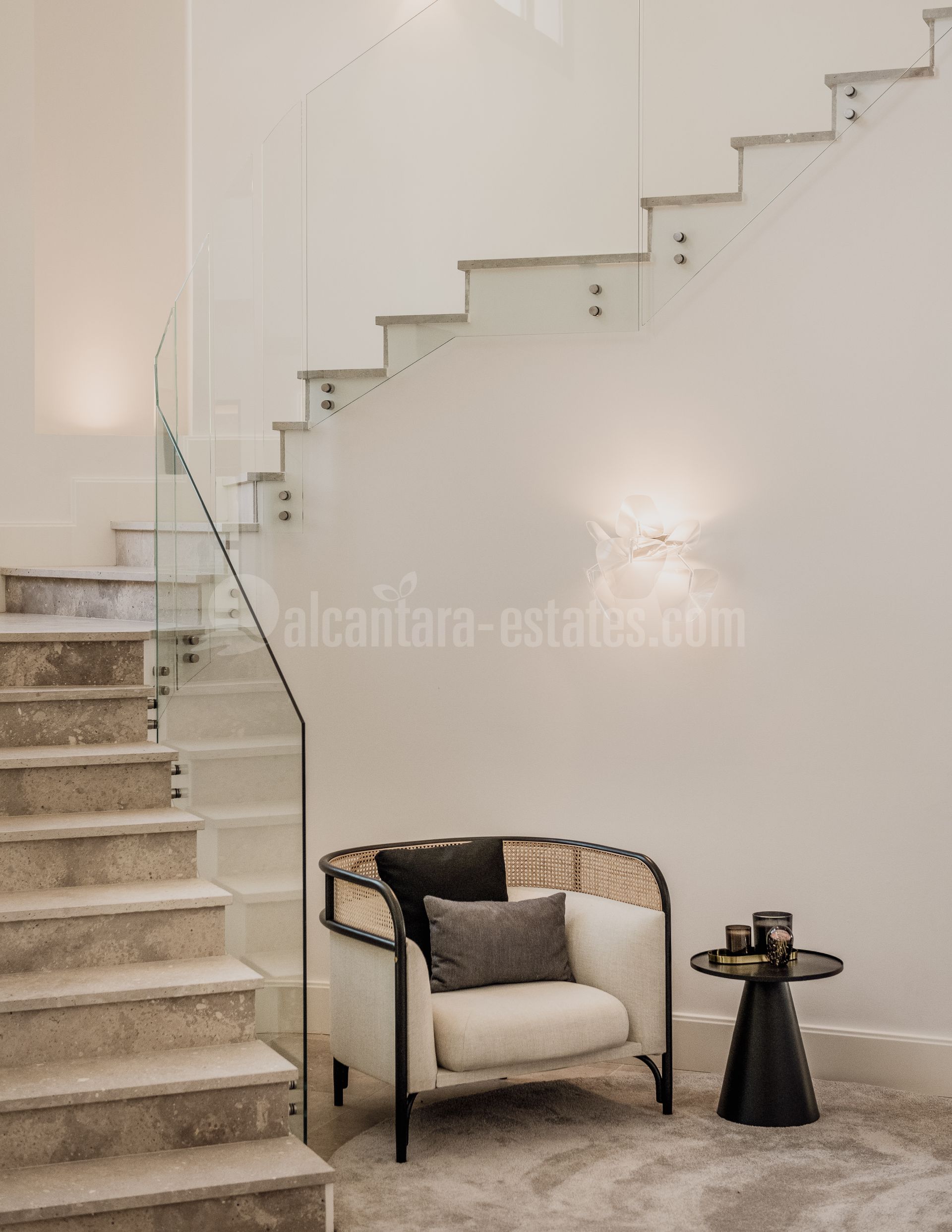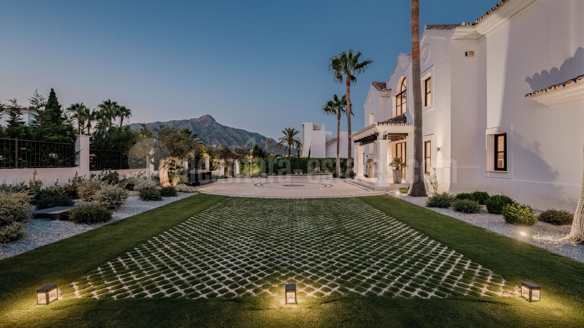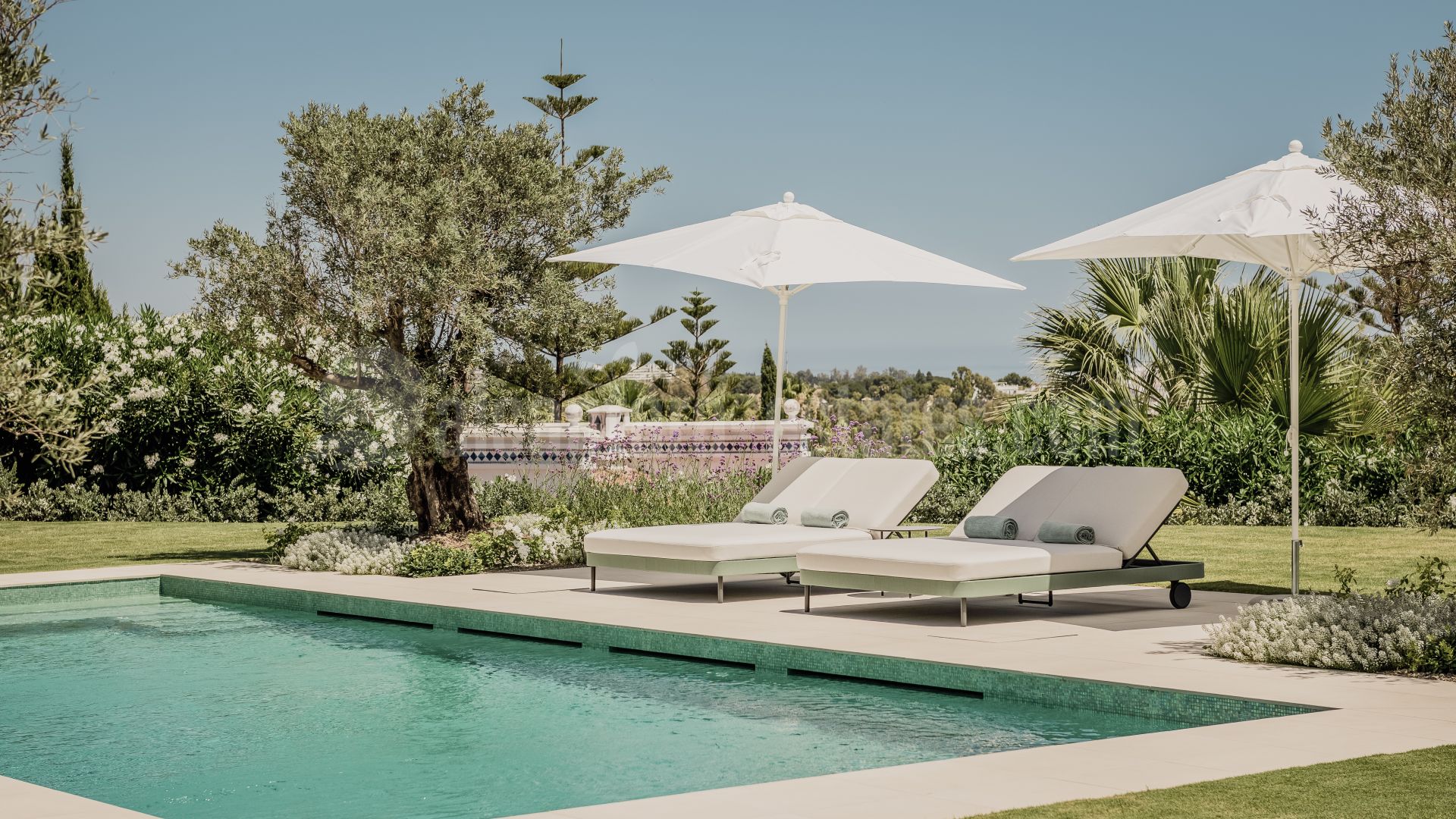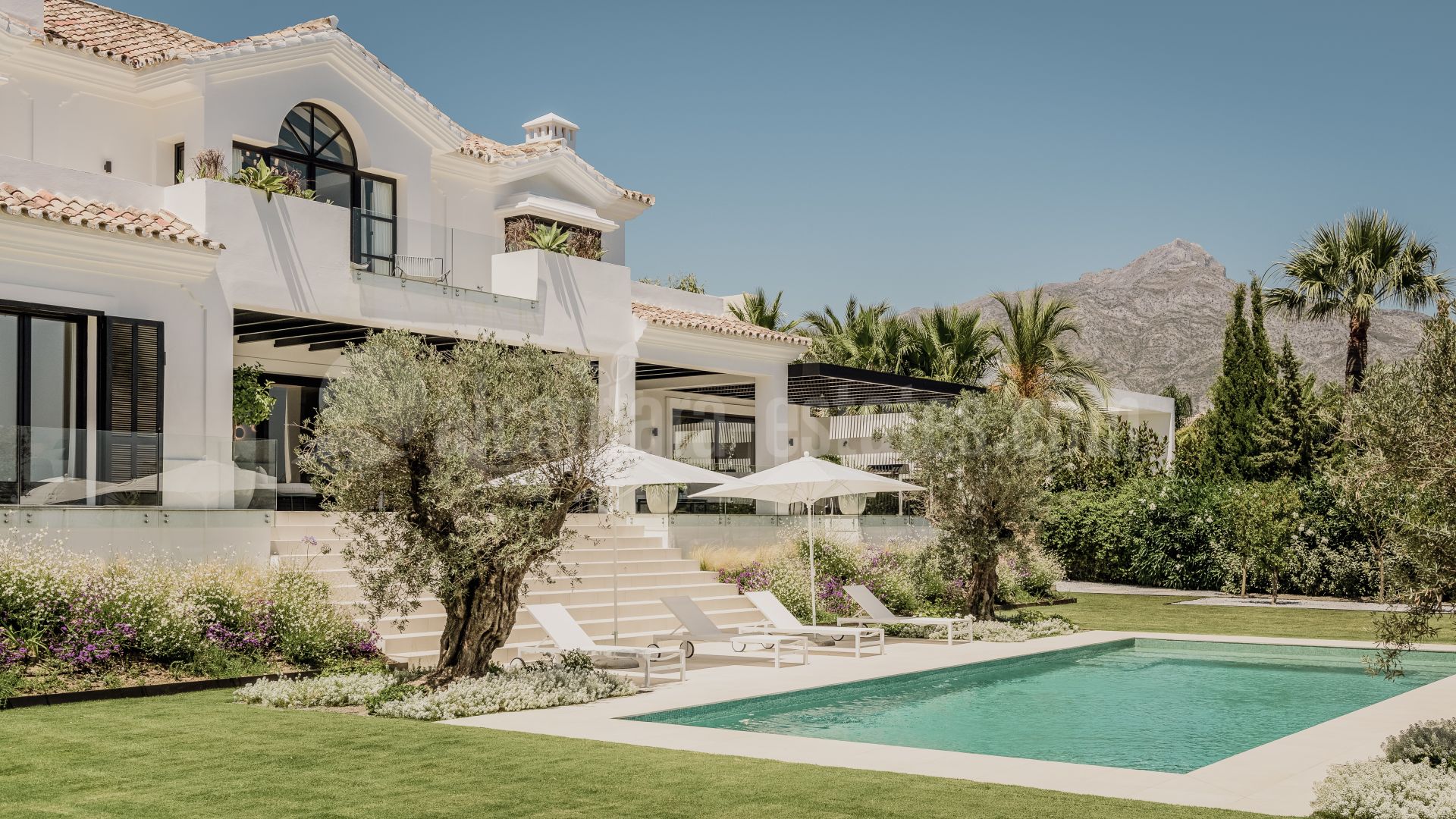 Villa Oliva es una propiedad hermosa y atemporal en venta en la prestigiosa comunidad de La Cerquilla, Nueva Andalucía. Recientemente reformada por completo con altos estándares, esta impresionante propiedad está situada en la calle principal de La Cerquilla. Ofrece vistas panorámicas al valle del golf y al mar. La propiedad tiene más de 1,000m2, distribuidos en 3 niveles, y se encuentra en una parcela de casi 3,000m2, lo que la convierte en una de las villas más grandes disponibles en La Cerquilla. Un impresionante patio de entrada con espacio para varios coches conduce a una entrada espaciosa con un techo de doble altura y vistas impresionantes al mar. El vestíbulo conduce directamente a una amplia sala de estar con fantásticas vistas al mar, un comedor que da al mar y una gran cocina abierta con una sala de televisión / familiar adyacente. Estas habitaciones tienen vistas al mar y conducen directamente a la terraza cubierta principal con una barbacoa incorporada y espacio para comer y descansar al aire libre. También en este nivel hay 3 dormitorios dobles con baños en suite y vestidores privados; uno de los dormitorios de invitados da al jardín, mientras que los otros dos dan al mar con terrazas privadas al aire libre.