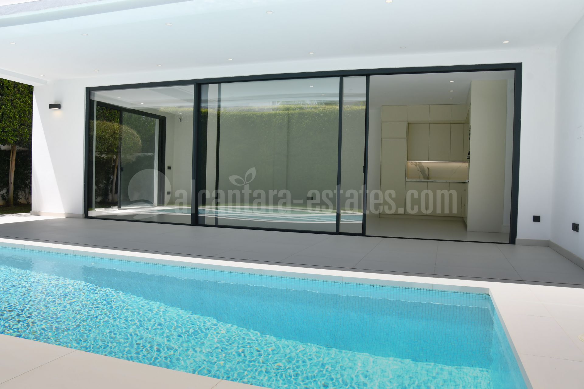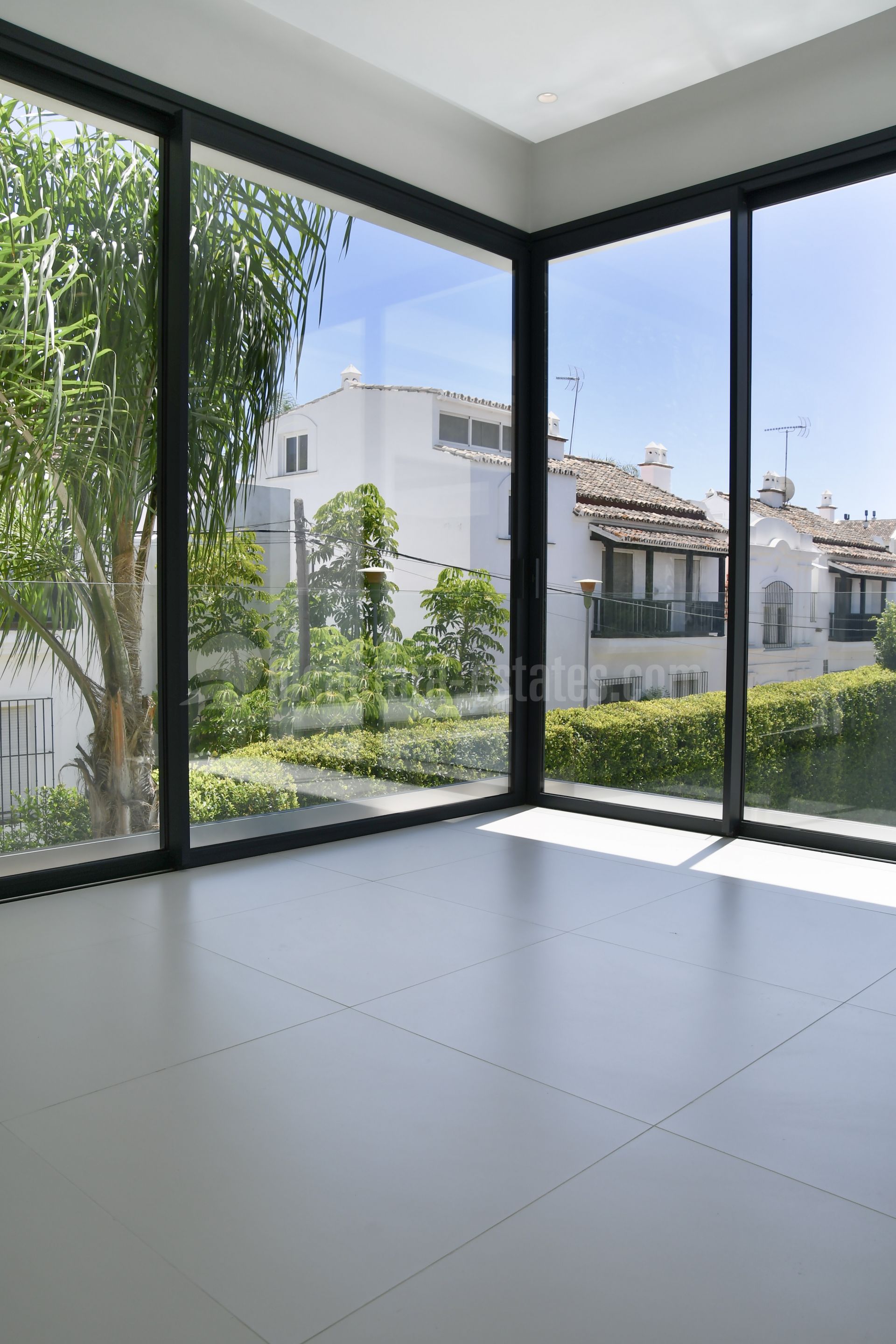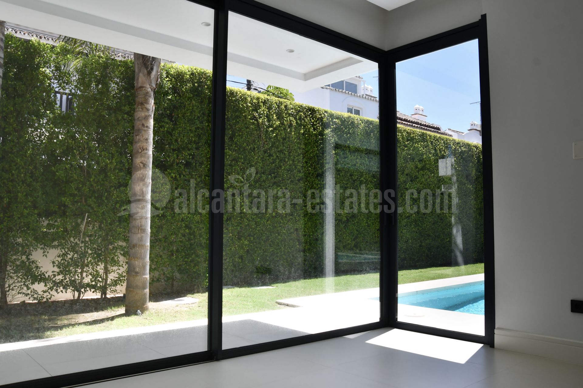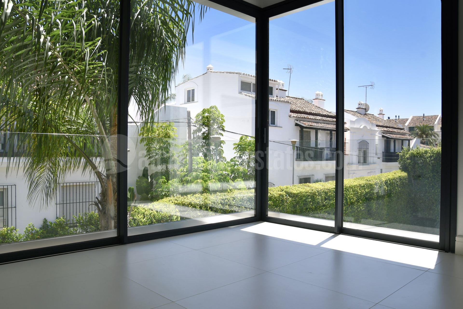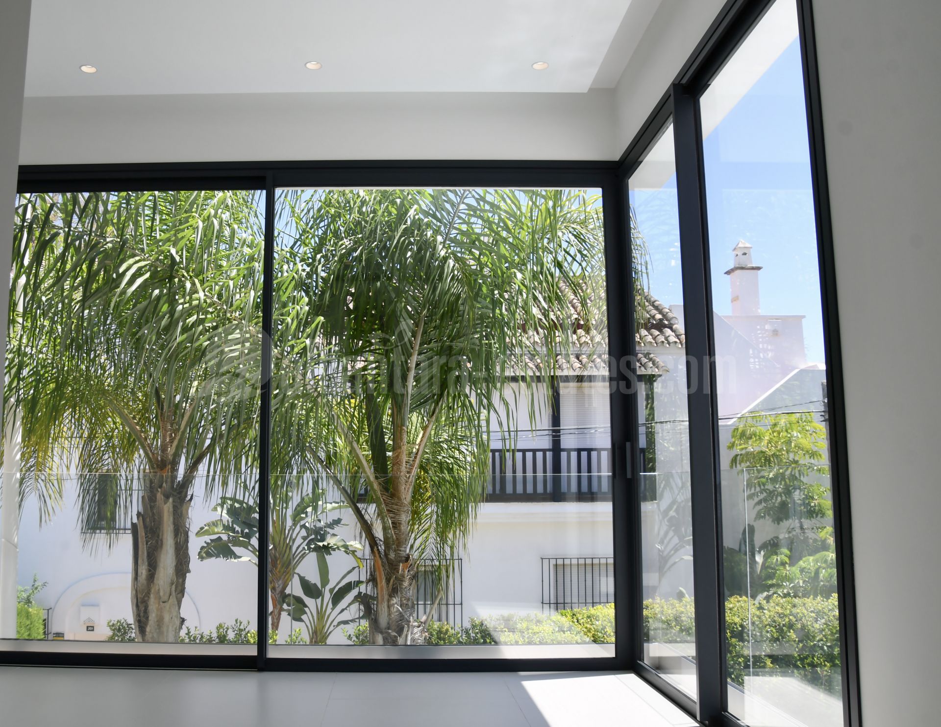 La villa en la Milla de Oro está ubicada cerca de la playa, a tres minutos a pie de Puerto Banús y a poca distancia de los supermercados.